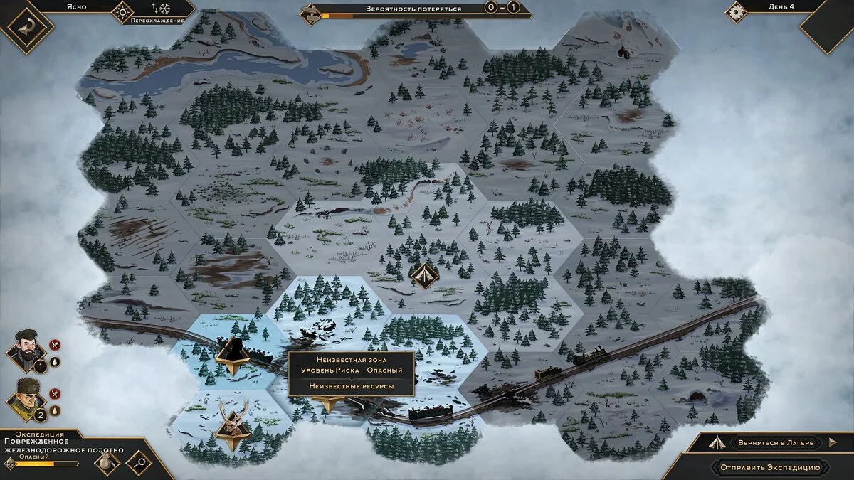 На следующий день появится возможность выйти на карту (иконка в левом верхнем углу экрана), поэтому сразу отправляйте экспедицию за добычей. Уровня опасности бояться не стоит, но следите за иконками бандитов и не приближайтесь к ним. Сразу идите в низ карты и обыскивайте место крушения поезда. Из ресурсов сейчас важно найти глину, уголь, грибы. Все разведанные ресурсы отмечаются, поэтому найти в следующий раз какой-то определенный ресурс будет просто.