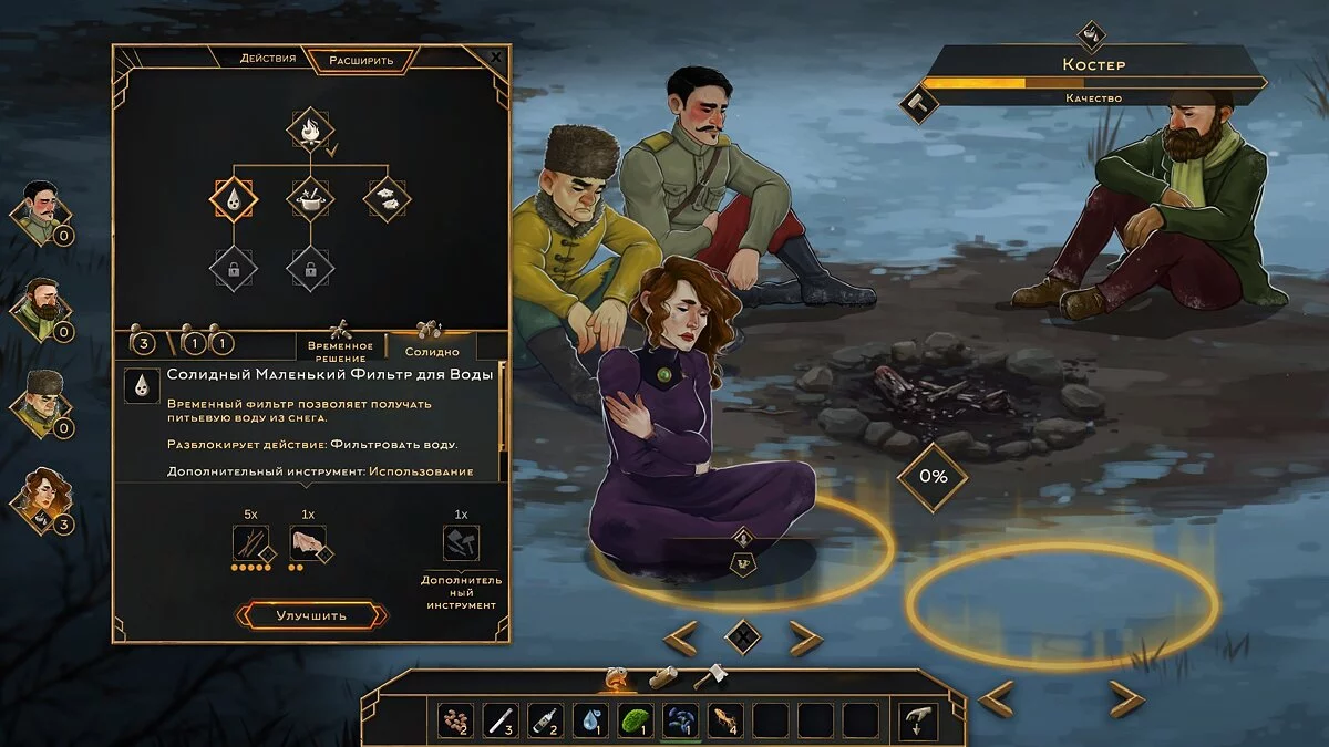 При помощи фильтра вода добывается прямо на месте. Ходить никуда не нужно — персонажи просто топят снег. Таким образом, сразу решается вопрос с жаждой. Следите, чтобы запасы не истощались. Фильтр нужно при первой возможности улучшить до большого. Жидкости понадобится много, ведь она расходуется не только в пищу, но и, например, для промывки ран.