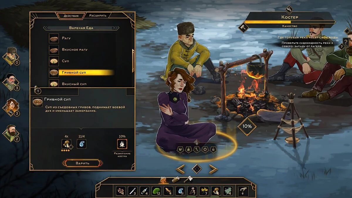 Все это, можно сказать, только начальный этап игры, на котором вы должны следить за физическими параметрами персонажа: голод, жажда, холод и и усталость. Если вы прислушаетесь к нашим советам, все базовые потребности персонажей будут удовлетворены. Далее нужно развивать лагерь, попутно решая возникающие проблемы.