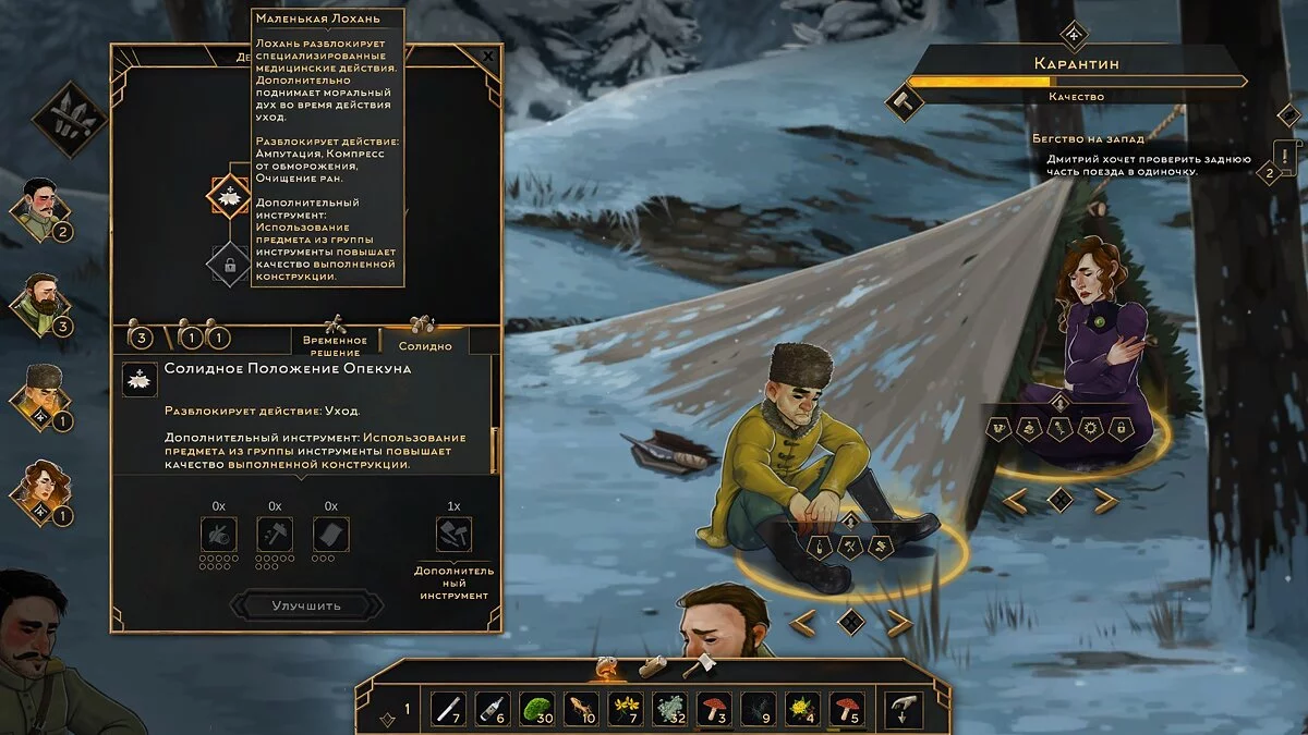 Если это ранение, то понадобится интенсивное лечение. Для этого нужно построить карантин и соответствующие апгрейды. К примеру, обморожение можно вылечить только открыв апгрейд «Маленькая лохань». В этом случае станет доступно изготовление компресса от обморожения. То же самое касается и перевязки ран. Чтобы открыть это действие, нужно изготовить «Медицинские инструменты».