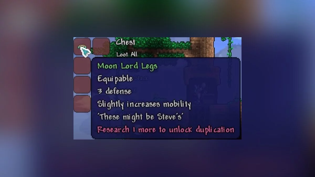 В итоге вы попадете в секретный мир, в котором довольно много объектов для исследования. Чтобы найти «Ноги Лунного лорда» (Moon Lord's Legs), ищите большие деревья, внутри которых находятся комнаты с сундуками. В одном из них вы с некоторым шансом найдете эти уникальные штаны:
