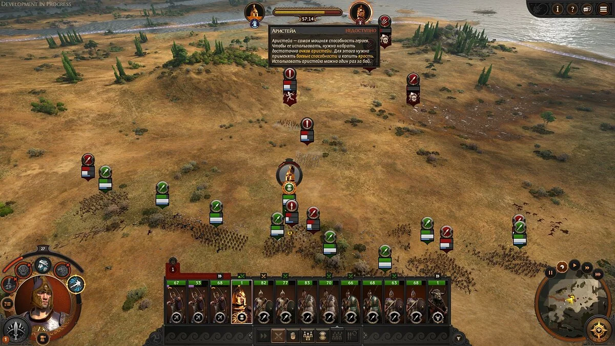 Таким образом, герои в Total War Saga: Troy находятся в особом симбиозе со своей армией. Они хорошо сражаются в первых рядах, но чтобы быстро заполнить шкалу ярости, нужно эффективно использовать основные войска. И наоборот: армия вполне способна одолеть противника и без прямого вмешательства героя, но все равно заинтересована в том, чтобы быстрее получить «Аристею». Очень изящное решение.