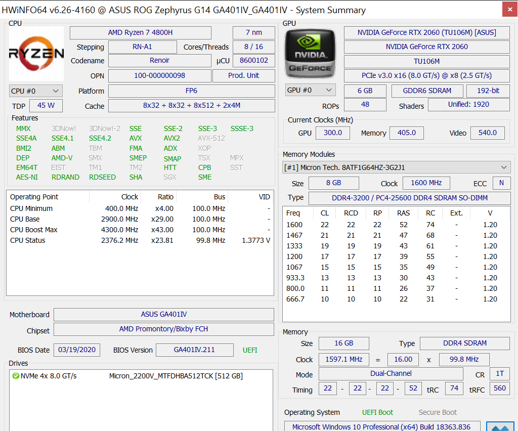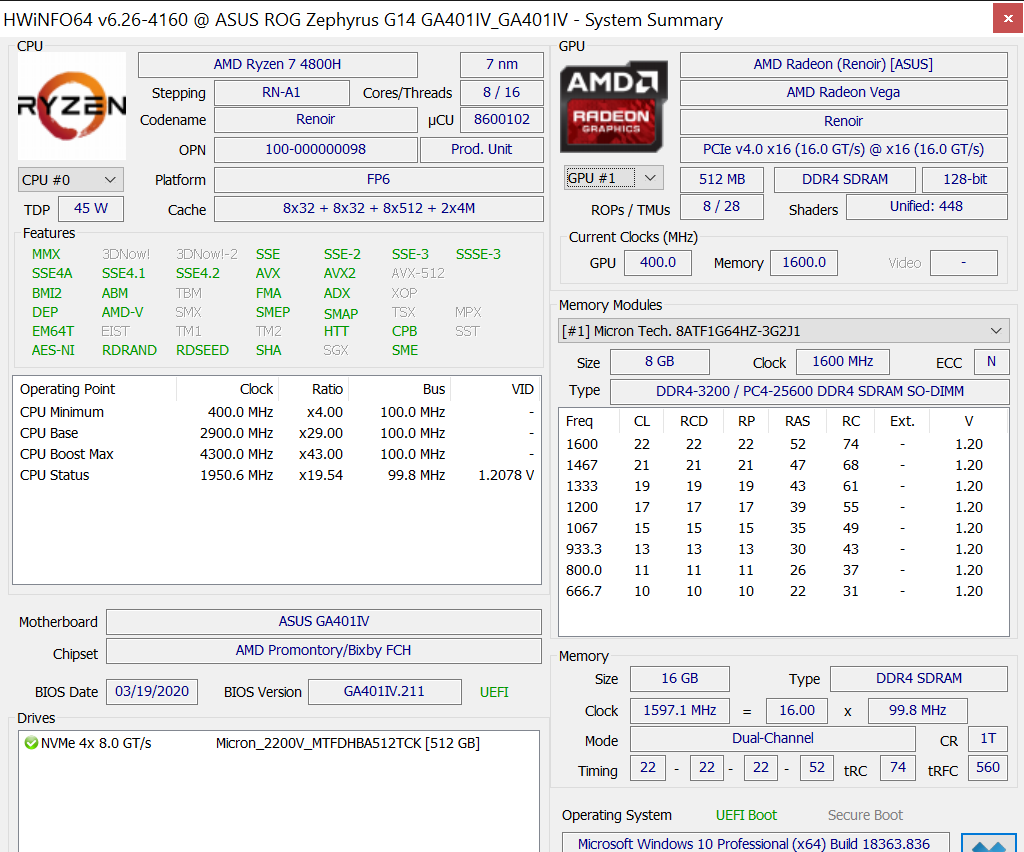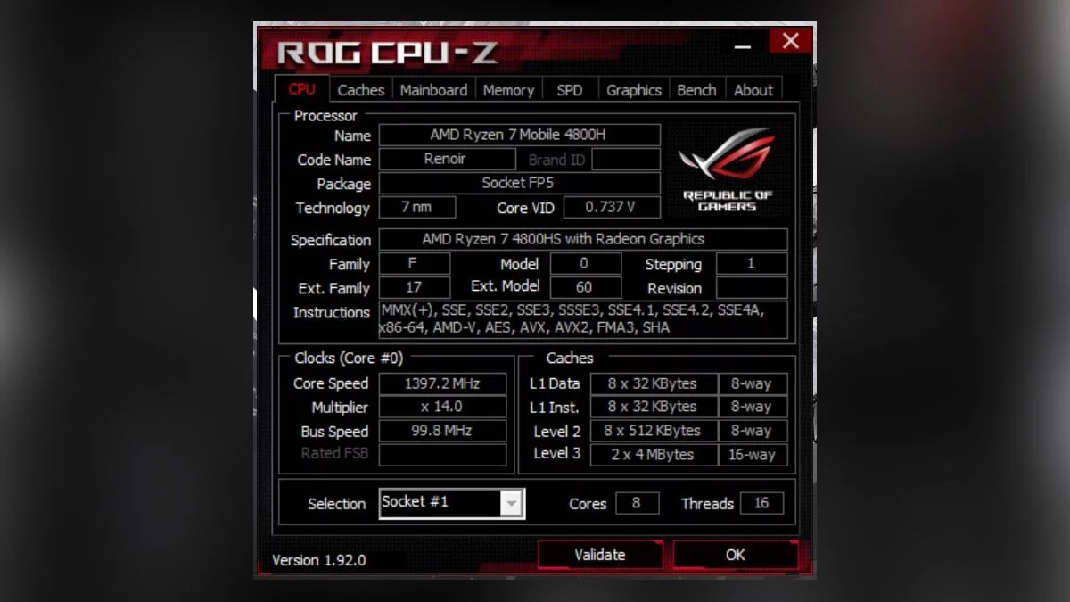 В ROG Zephyrus G14 устанавливаются процессоры от AMD, что не может не радовать, так как «красных» мобильных решений на рынке все же не так много. Причем, несмотря на компактный формат ноутбука, в него может быть установлен производительный Ryzen 7 4800HS или Ryzen 9 4900HS. У обоих процессоров восемь ядер и шестнадцать вычислительных потоков. Эти модели были созданы в сотрудничестве с AMD, специально для ультратонких ноутбуков ASUS. Отличительная их особенность — сниженный теплопакет, который составляет всего 35 Вт. В нашем экземпляре был установлен Ryzen 7 4800HS. Кроме того, есть и комплектации с процессором попроще — Ryzen 5 4600HS.