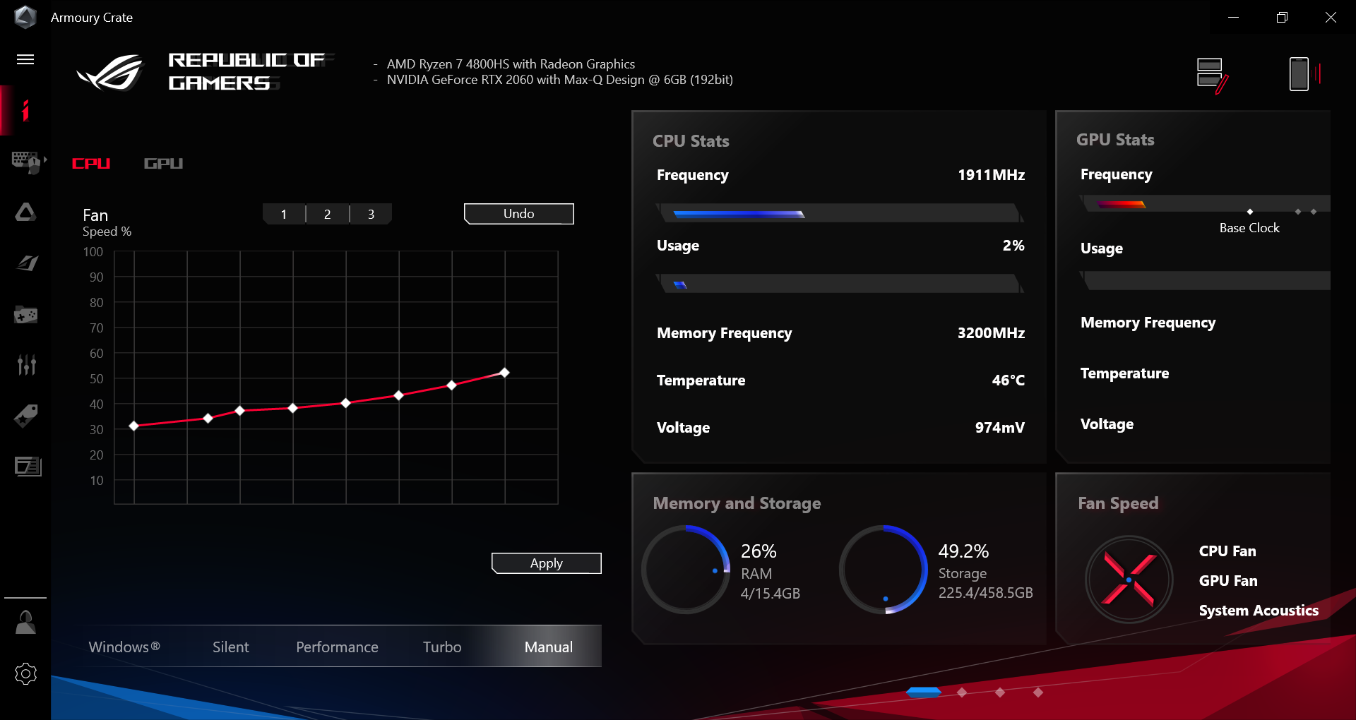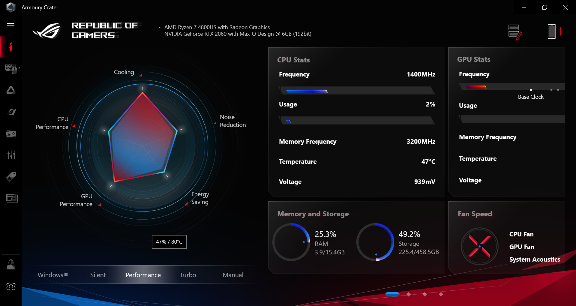 Как и в других моделях ноутбуков ROG у G14 есть предустановленное программное обеспечение Armoury Crate для контроля за уровнем шума и производительностью. Разумеется, есть режимы как для офисной работы, так и для игр. Все они относительно тихие и даже самый мощный режим «Турбо», в котором мы и проводили игровые тесты, по субъективной оценке совершенно не мешает играть. Уровень шума в таком режиме работы доходит всего до 45 дБ, что для игрового ноутбука отличный показатель.