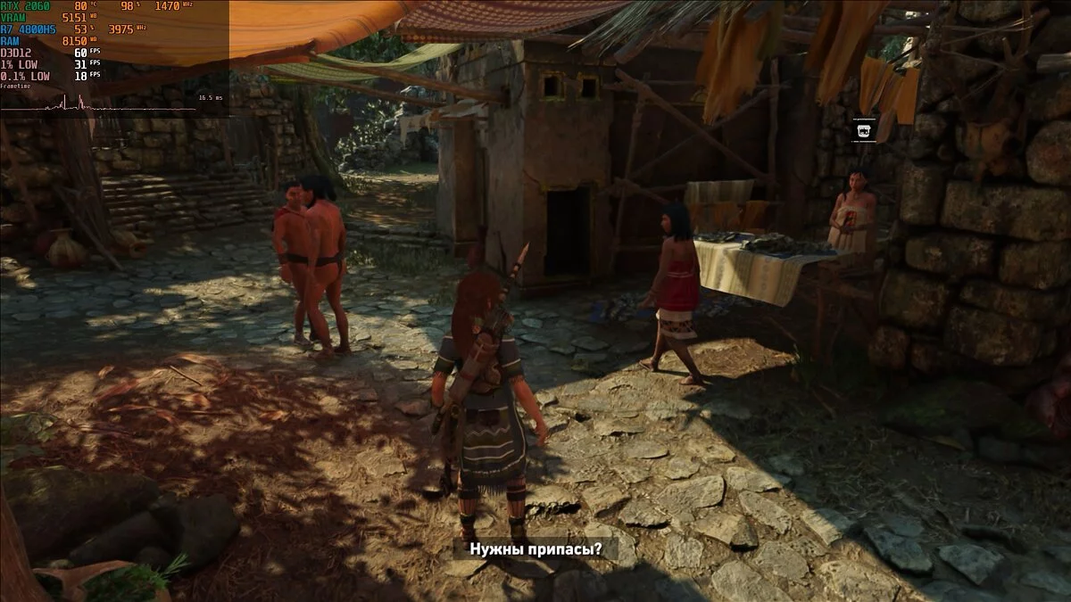 Игра стабильно выдавала около 60 кадров. Большую часть времени железо обеспечивает плавный геймплей, однако при первом забеге удалось поймать парочку резких просадок, что отразилось на показаниях редких и очень редких событий. В помещениях и других менее требовательных сценах FPS ожидаемо оказался еще выше.
