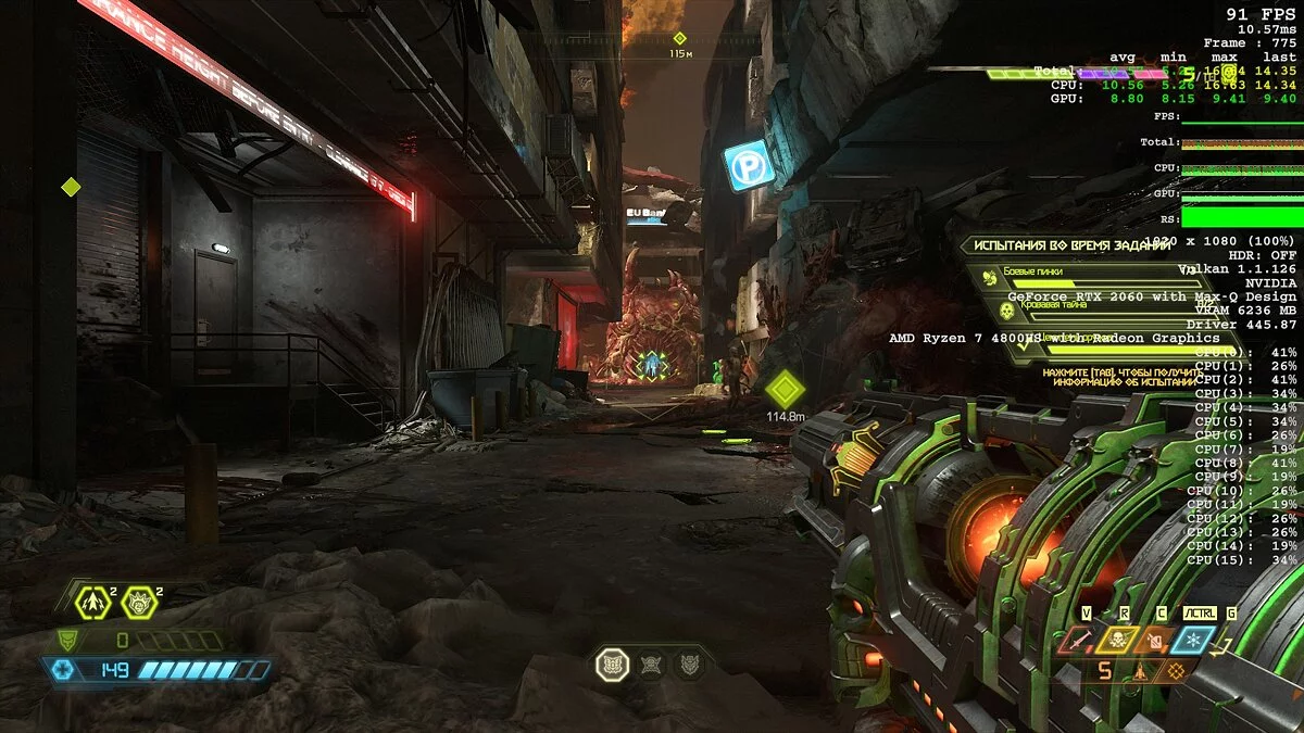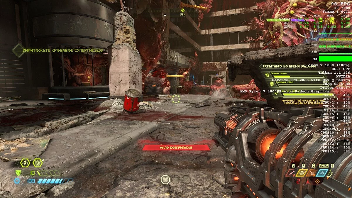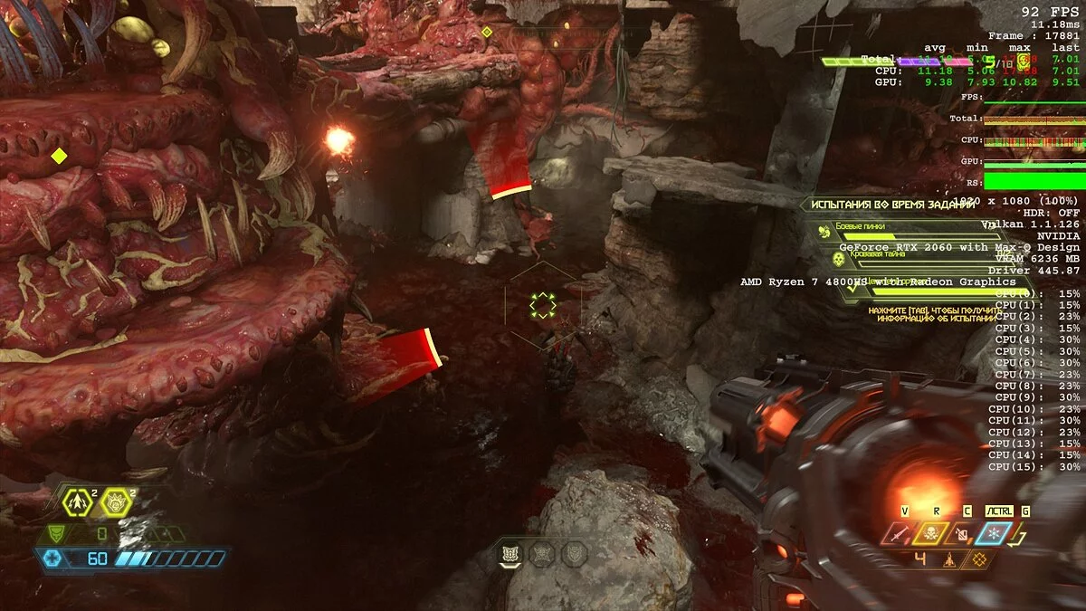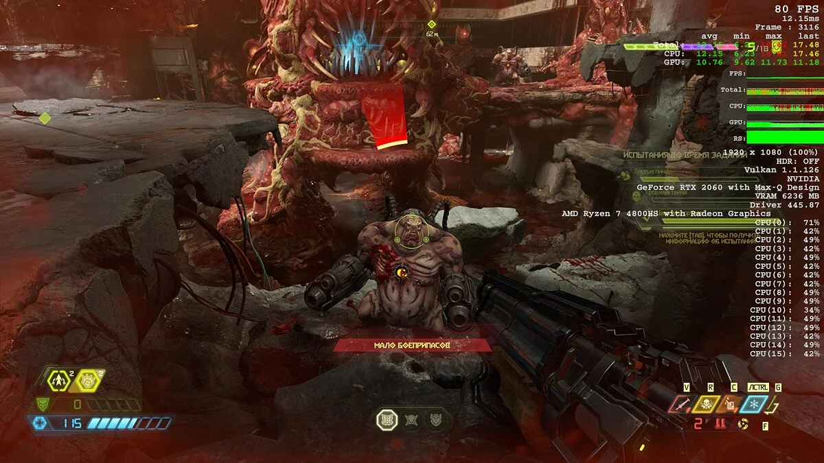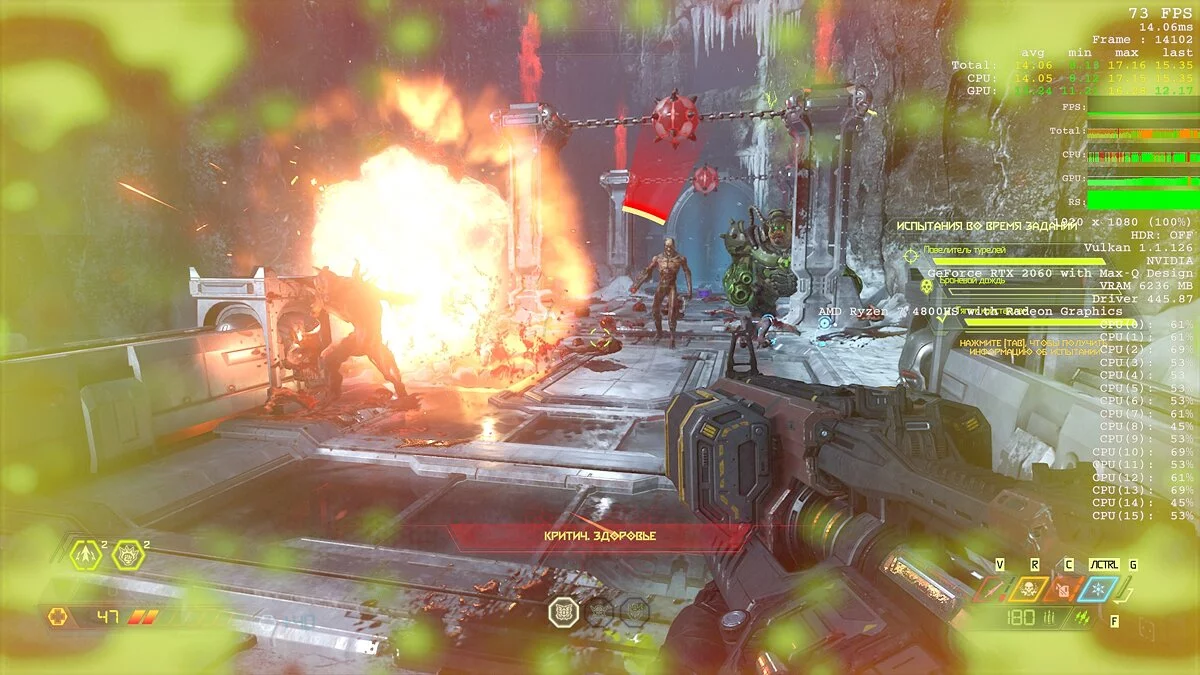 Doom Eternal. Так как игра динамичная, то крайне важно, чтобы она шла плавно, без резких скачков времени кадра. Связка процессора и видеокарты смогла обеспечить высокую частоту кадров на ультра настройках. Большую часть времени FPS находился выше 90, но случались и просадки до 70-80 кадров. На дисплее 120 Гц при включенной вертикальной синхронизации геймплей ощущается гораздо плавнее, чем при стандартных 60 кадрах в секунду. Поэтому искусственно ограничивать частоту кадров желание не возникало.