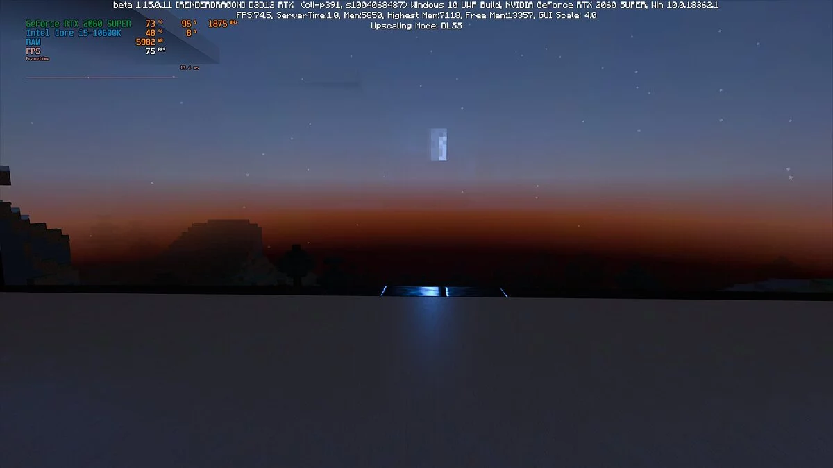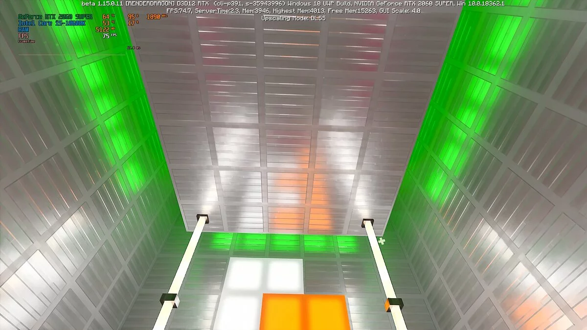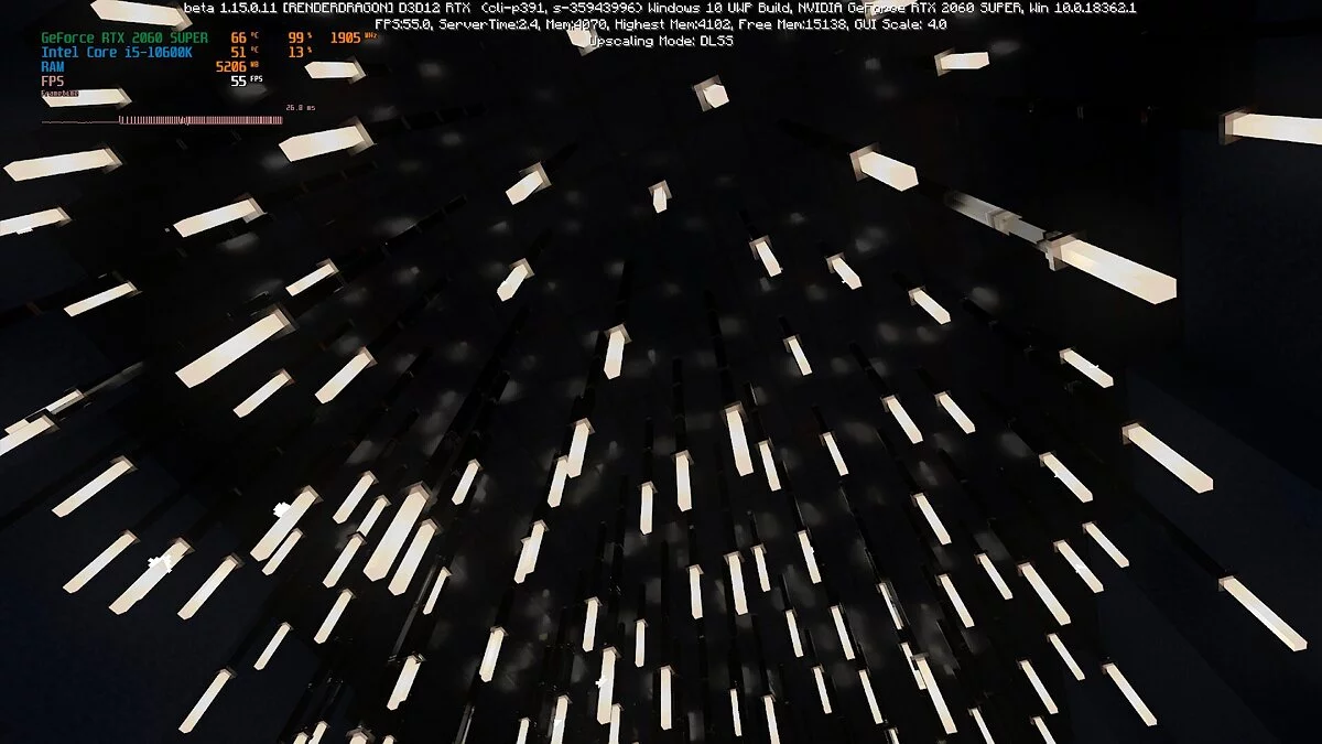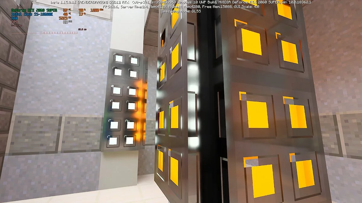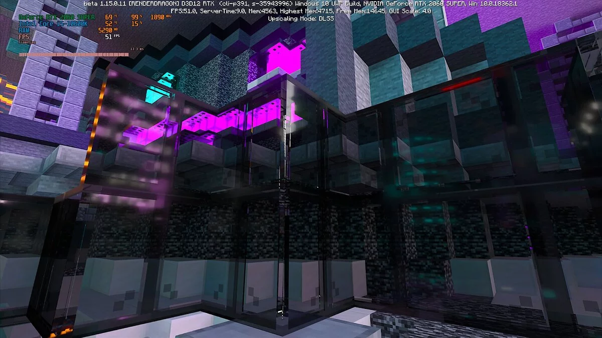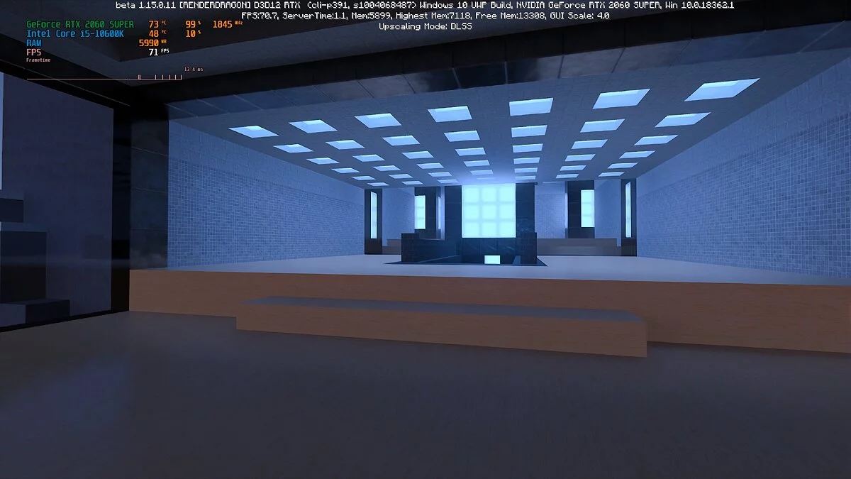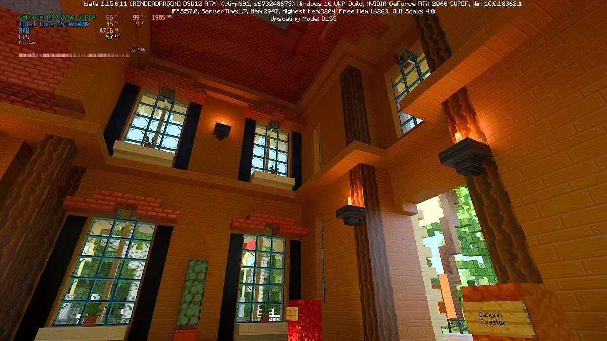 Minecraft RTX. Прошлая кастомная сборка с GeForce RTX 2070 SUPER отлично себя показала в Minecraft RTX. На любой из карт пакета RTX, созданного специально для демонстрации технологии NVIDIA, виден потенциал трассировки лучей. Реалистичное освещение преображает кубический мир игры до неузнаваемости. Что до GeForce RTX 2070 SUPER, то тут результат получился скромнее, что ожидаемо от видеокарты классом ниже.
