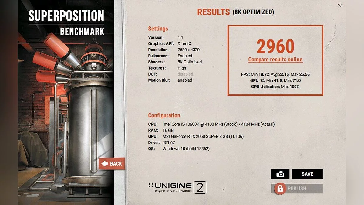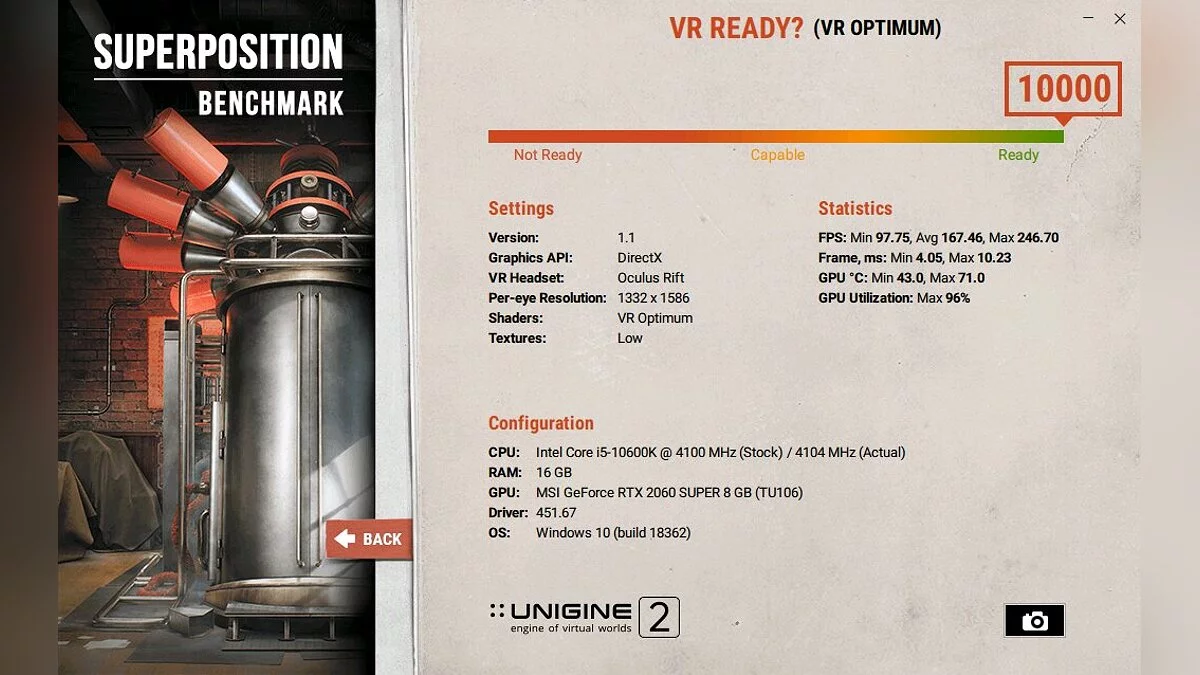 В Superposition приятно удивила температура графического процессора под нагрузкой. Даже при прогоне тестов с пресетом 8K она упиралась максимум в 71 градус. Что до профиля VR, сборка оказалась вполне готова к этому испытанию даже с максимальными настройками. Спасибо двухканальному режиму работы памяти. Без него в 2020 игровому устройству живется туго.
