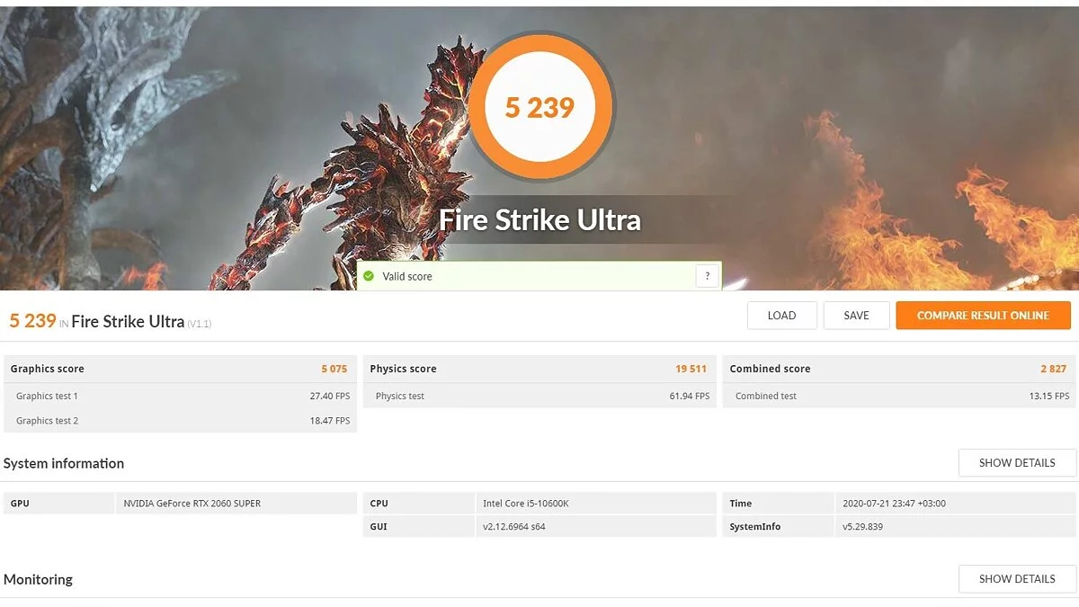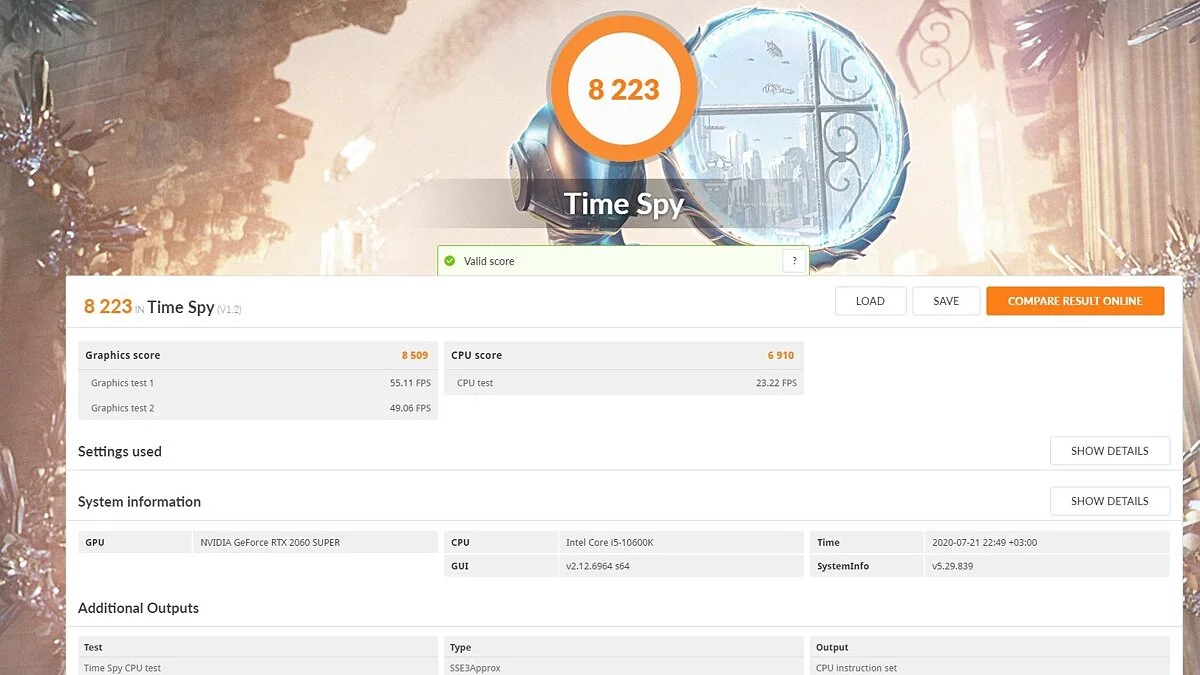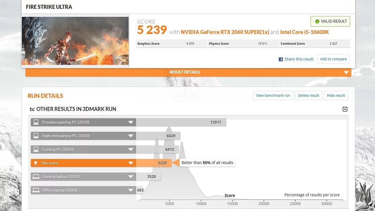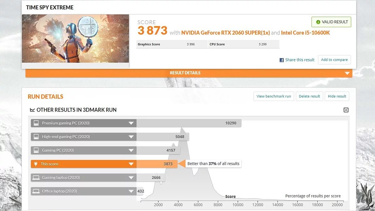 В целом пара Intel i5-10600K и GeForce RTX 2060 SUPER неплохо справилась со стандартными профилями Time Spy и Fire Strike (разрешение 1080p), обогнав по «попугаям» 68% и 88% результатов других пользователей соответственно. А вот в Time Spy и Fire Strike с припиской Ultra (нагрузка 4К контентом) пара смогла перегнать только 37% и 50% результатов.