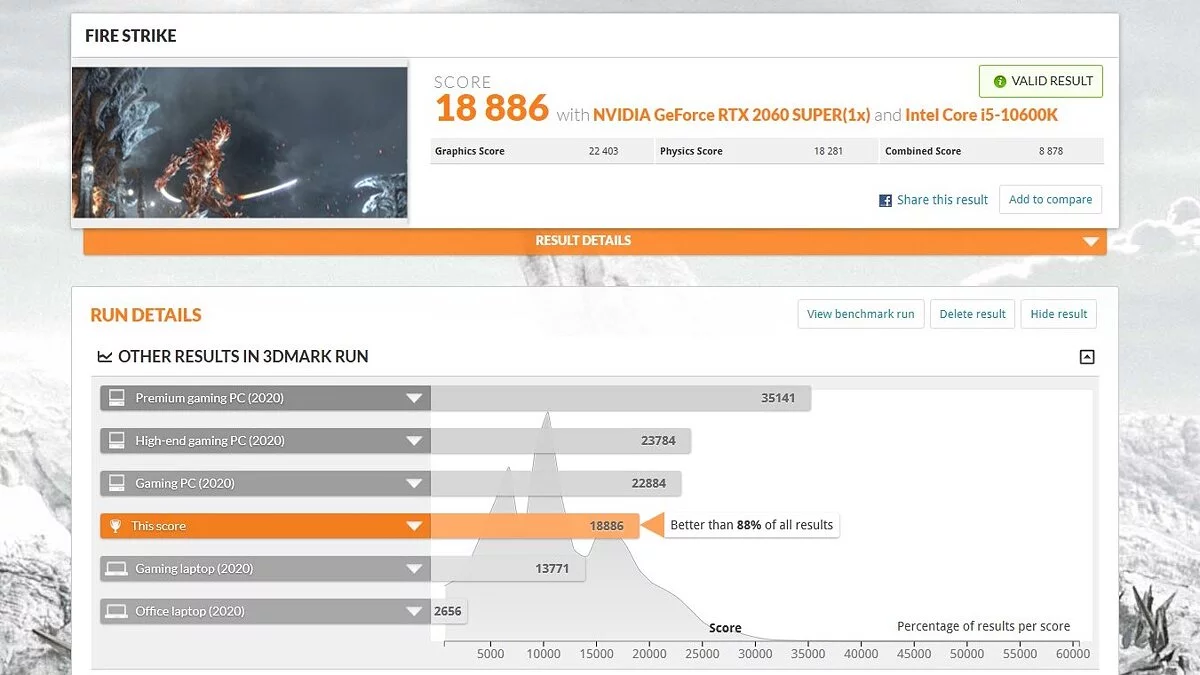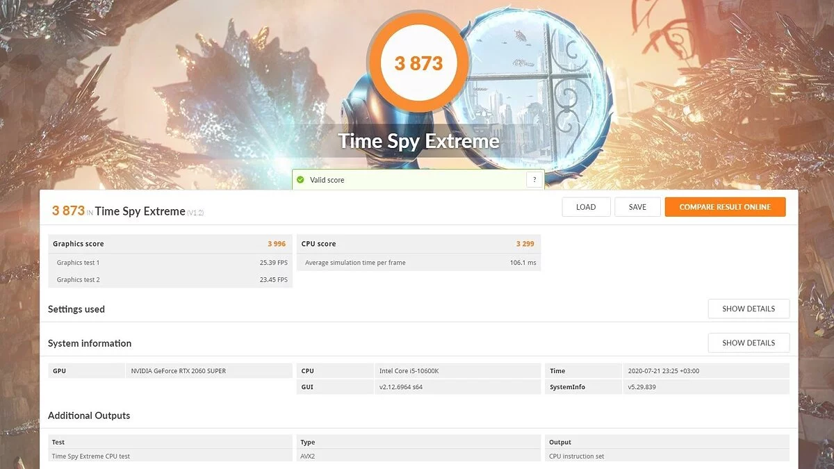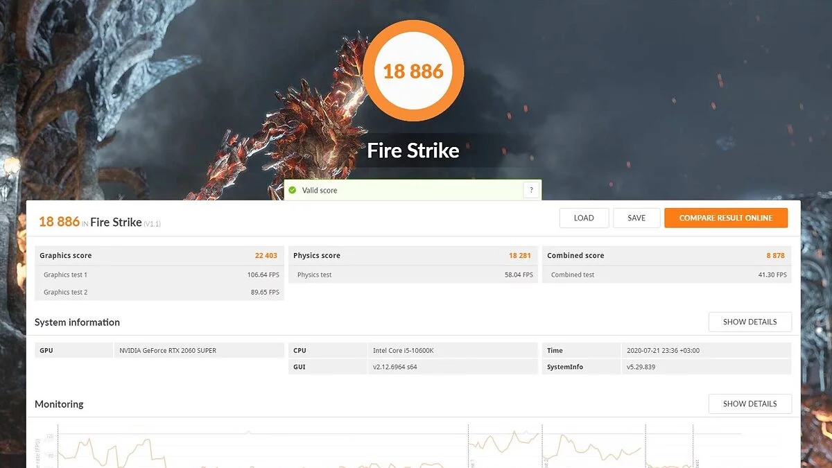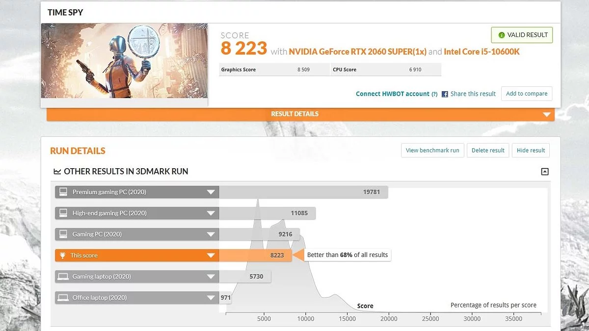 В целом пара Intel i5-10600K и GeForce RTX 2060 SUPER неплохо справилась со стандартными профилями Time Spy и Fire Strike (разрешение 1080p), обогнав по «попугаям» 68% и 88% результатов других пользователей соответственно. А вот в Time Spy и Fire Strike с припиской Ultra (нагрузка 4К контентом) пара смогла перегнать только 37% и 50% результатов.