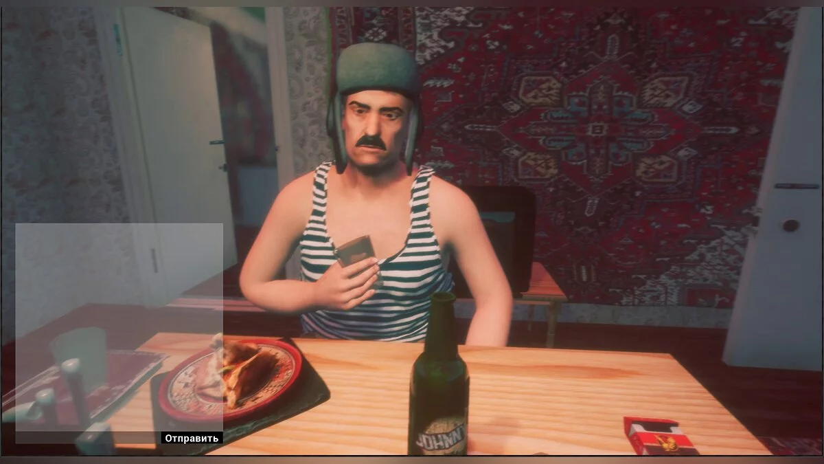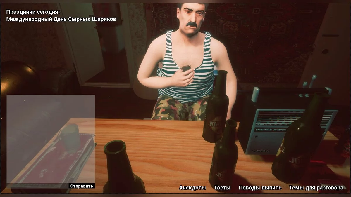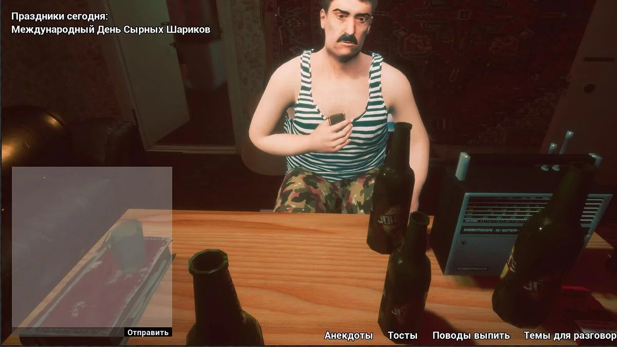 А вот и та игра, благодаря которой и появился этот топ. В этот раз разработчиком выступила студия Vodka Productions & Consumptions, но новым авторам удалось унаследовать и даже приумножить все то хорошее, что было в прошлой их игре — «Симуляторе сидения у Подъезда», о которой мы поговорим чуть позже. Теперь вам не придется проникаться антуражем в гордом одиночестве. Вместо этого, вы можете позвать за стол своего друга или же распивать алкоголь со случайным игроком. Официальное описание «Симулятора Бухания Online» действительно способно продать игру любому жителю СНГ: