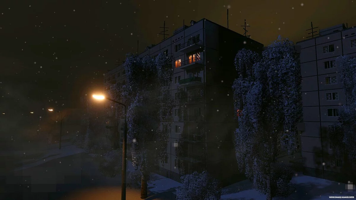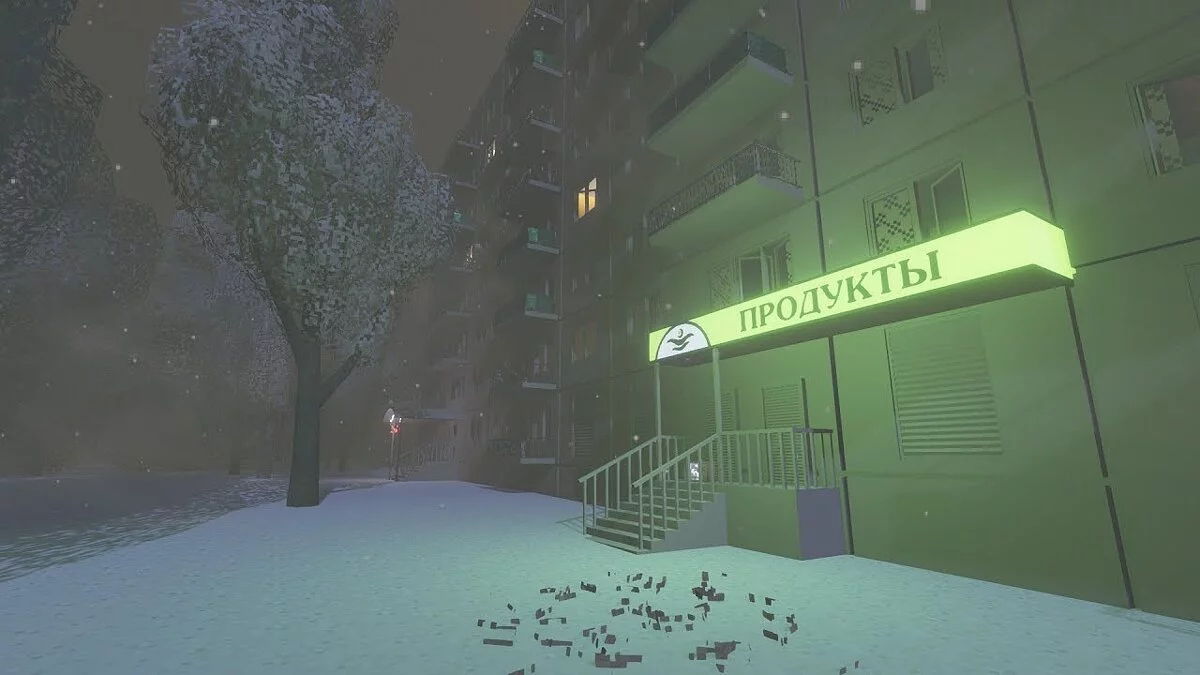 В вашем распоряжении небольшой спальный район из среднестатистического российского города. Панельные дома, заснеженные улицы, обшарпанные подъезды. Все на месте. К сожалению, никакого наполнения контентом тут нет. Из интерактивных объектов, с которыми можно взаимодействовать, есть только сломанный радиоприемник и холодильник с продуктами.