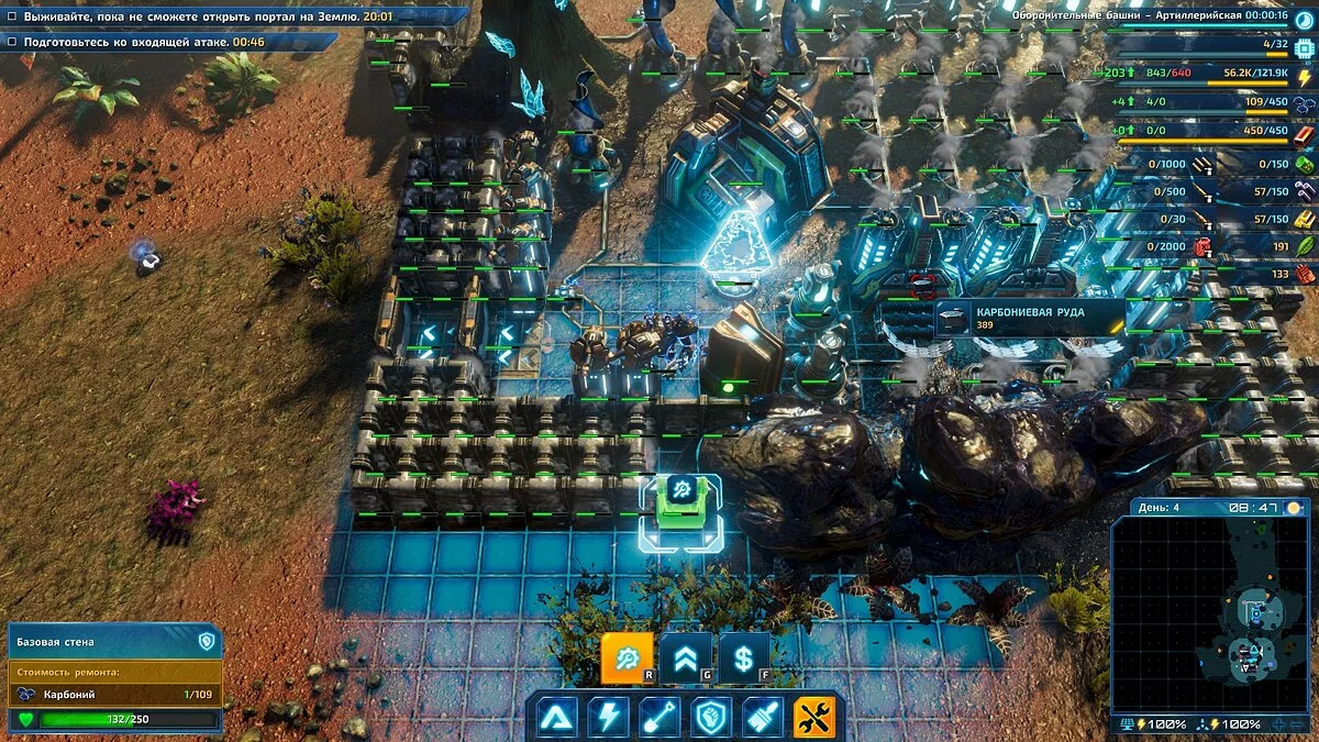 Всё играется гармонично, темп почти не проседает: высадились, разведали местность, попутно накрошили ресурсов, прикинули лучшее расположение базы, начали её строить. Тут первая волна врагов налетает — отбились; строим базу дальше. До следующей атаки времени мало, приходится на лету менять приоритеты между расширением, защитой, поиском баланса в производстве и добычей энергии.