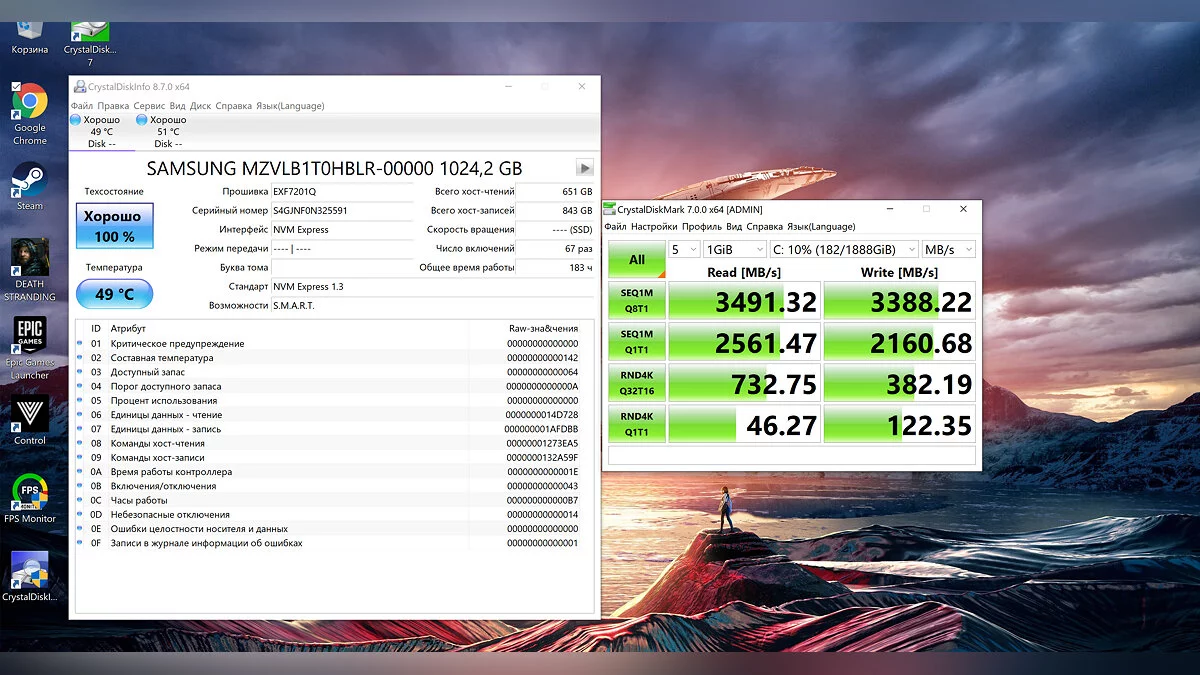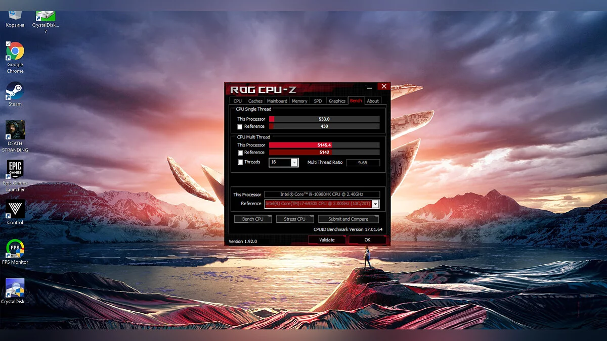 Intel Core i9-10980HK с лихвой хватает современным играм, а для работы с музыкой, графикой или видео он пригодится как никогда кстати. Для теста процессора мы использовали CPU-Z и Cinebench R20. Результаты вы можете увидеть на скриншотах. Также с помощью CrystalDiskMark мы оценили скорость двух объединенных SSD Samsung MZVLB1T0HBLR-00000 по 1 ТБ каждый.