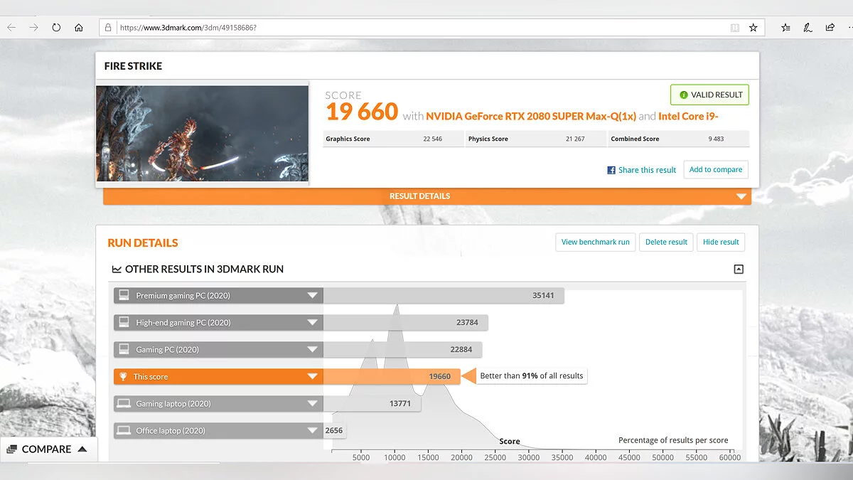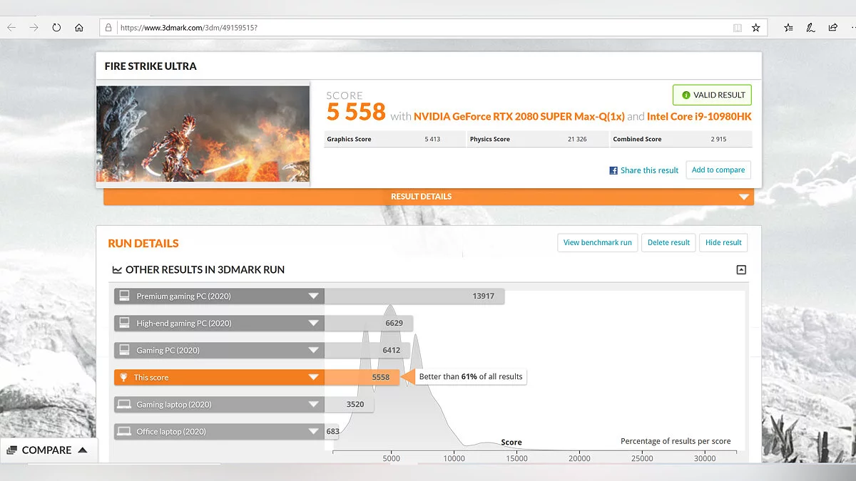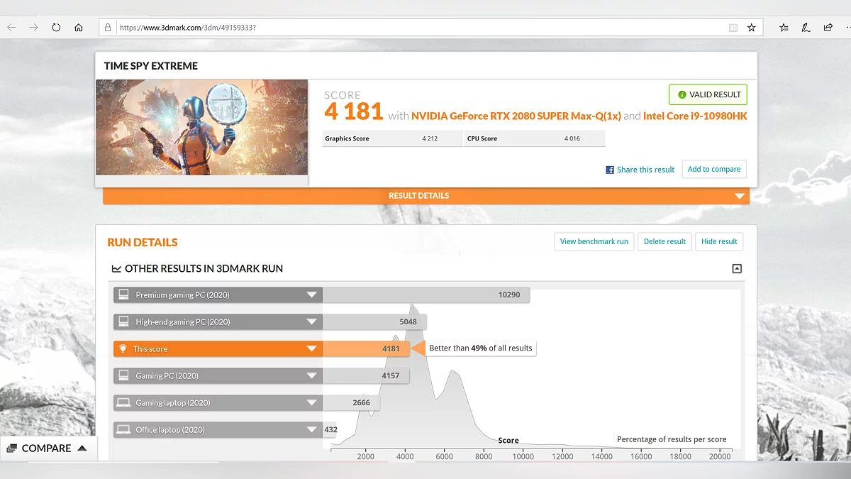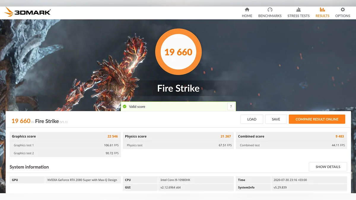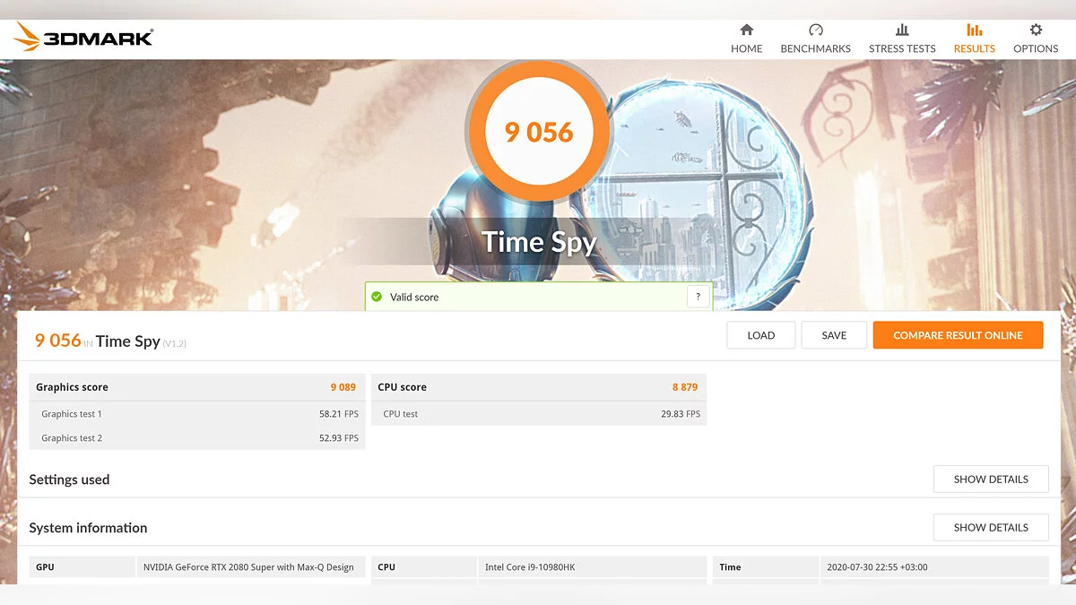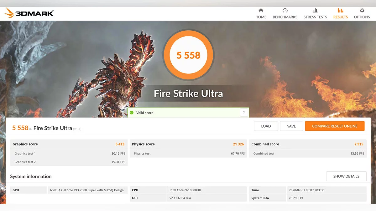 В 3DMark ноутбук показал отличные результаты, которые можно сравнить с современным геймерским ПК. Мы провели тесты в Time Spy и Fire Strike как в классическом режиме (в разрешении 1080p), так и в Ultra (в 4K).