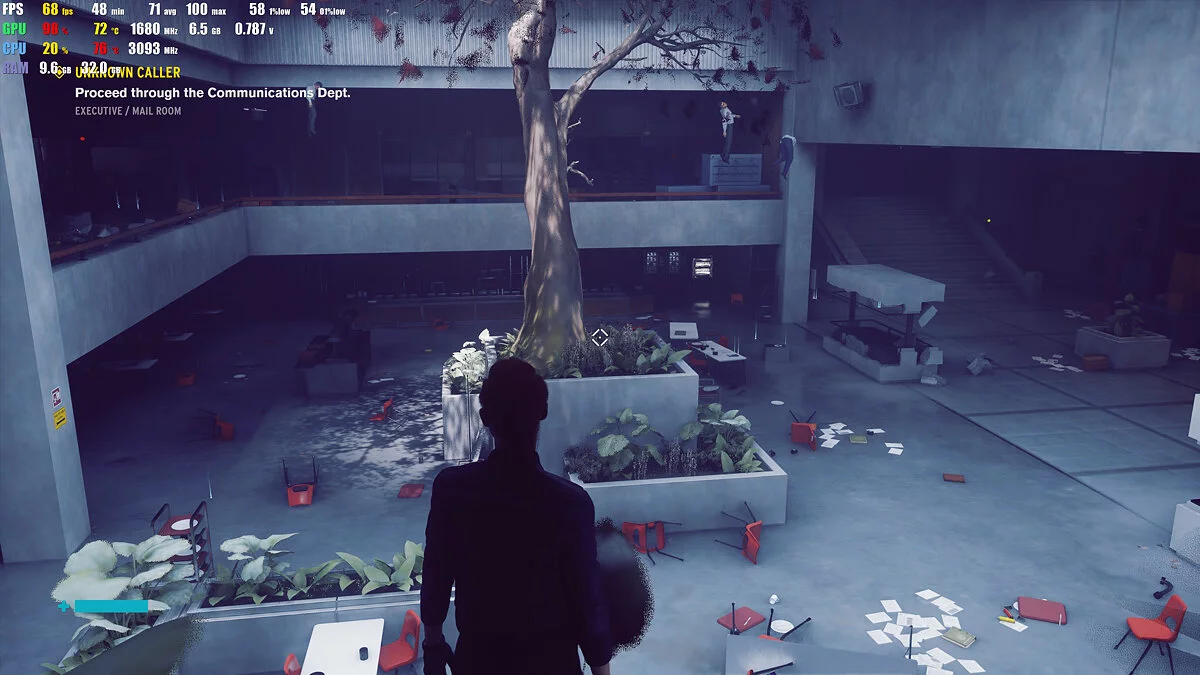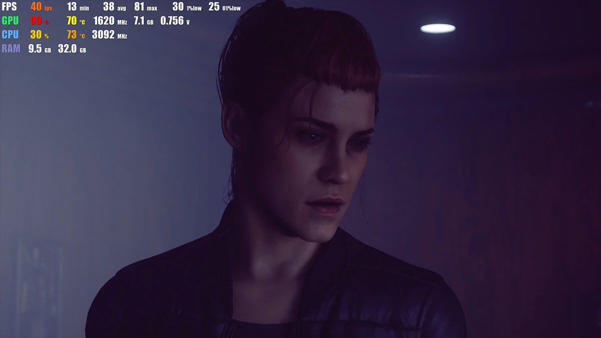 В режиме 3840x2160 с DLSS и максимальными настройками графики частота кадров проседала до 36 FPS. Такой показатель получился из-за дополнительных настроек рейтресинга: трассировки обломков, лучей контактных теней и непрямого рассеянного освещения. Если выставить предустановки рейтрейсинга на средние, то игра сразу же прибавляет 5-10 FPS. Все же главная героиня почти в любой момент может вырвать кусок бетона из стены и швырнуть его, например, в тележки со всяким мелким мусором. Обработка всех этих динамических объектов в рейтрейсинге дополнительно нагружает видеокарту.