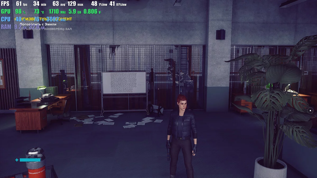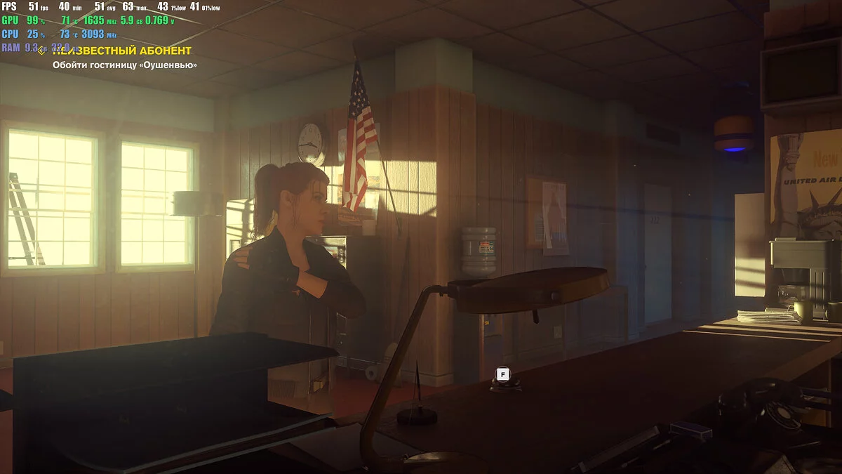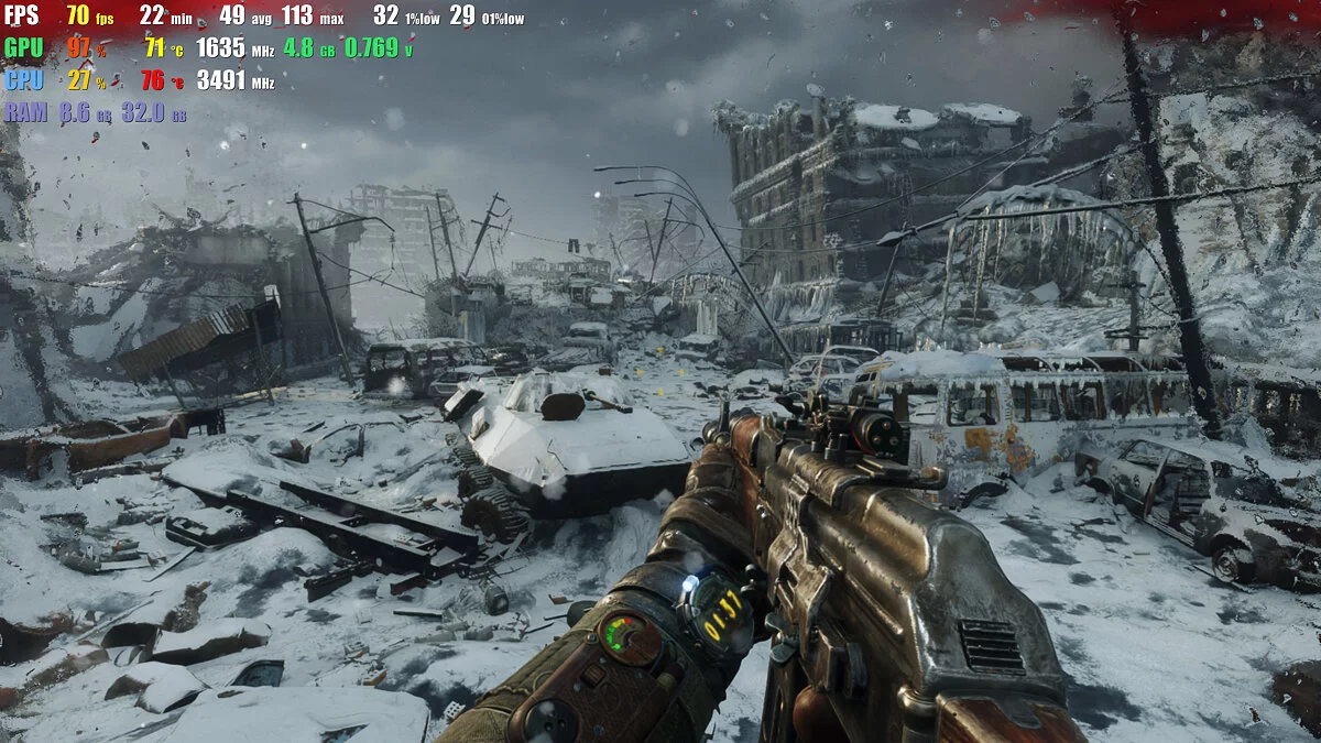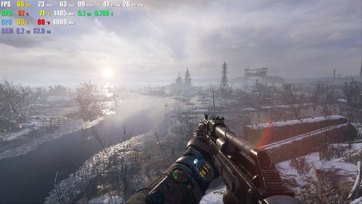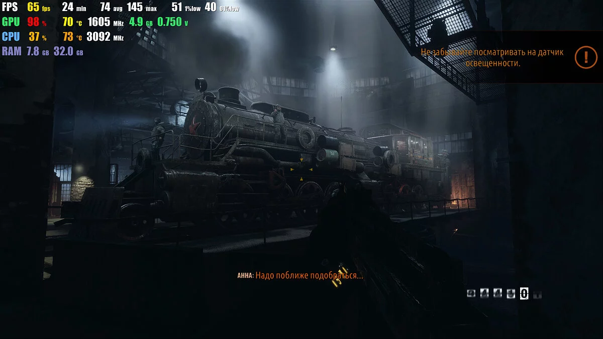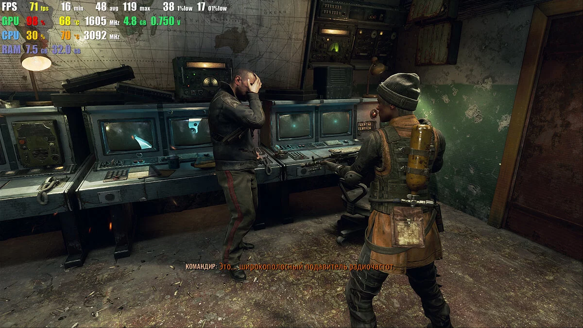 С разрешением 3840x2160 и максимальными настройками средняя частота кадров держалась в районе 40-45. Стабильные 60 FPS получились при 2K-разрешении, а настройка трассировки лучей была выставлена на «Высокое». При этом игра опускала счетчик до 50 FPS в катсценах, но в геймплее была стабильна, будь то перестрелка в бункерах или прогулка по заснеженным топям Волги.