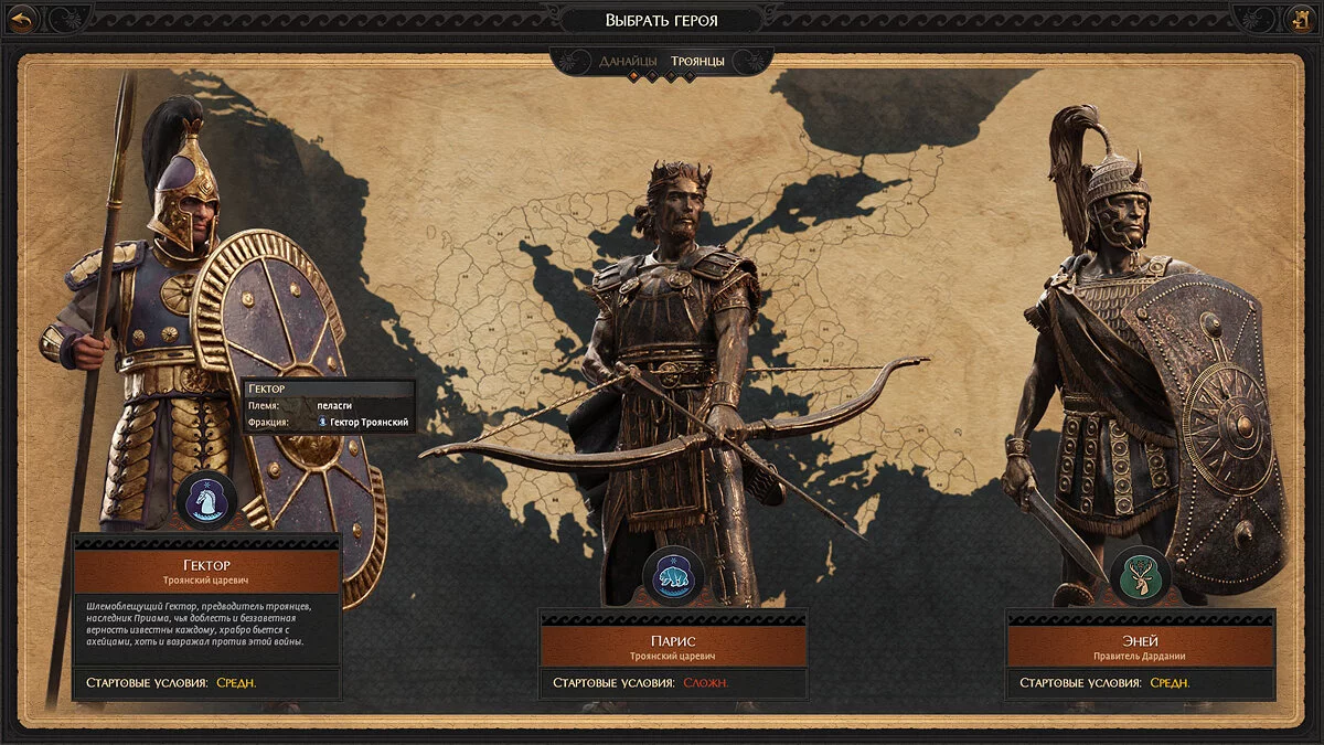Игрок может выбрать одну из двух фракций — данайцев и троянцев. У каждой из сторон конфликта есть по четыре основных героя со своими стартовыми поселениями, армией и, конечно, эпическим персонажем во главе. Несмотря на обилие действующих лиц в поэмах Гомера, Creative Assembly выделили всего восемь основных персонажей. У каждого из них собственная сюжетная линия, линейка заданий и условия победы на глобальной карте кампании.