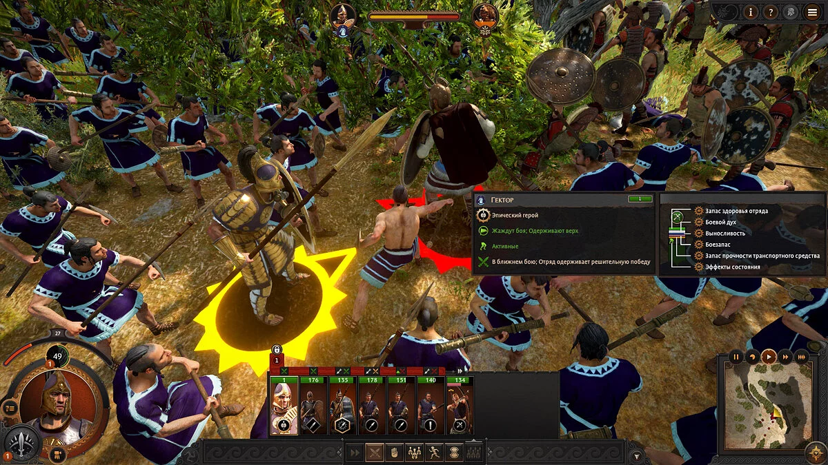 Впрочем, кое-что новенькое разработчики все же припасли, а именно механику под названием «Аристея». В древнегреческой поэзии это слово означает особенно героические моменты в жизни каждого героя. В Total War Saga: Troy это мощные способности, которые можно использовать ближе к концу боя, когда герой набрал достаточно очков ярости. Очень часто «Аристея» либо завершает бой, либо становится его поворотной точкой.
