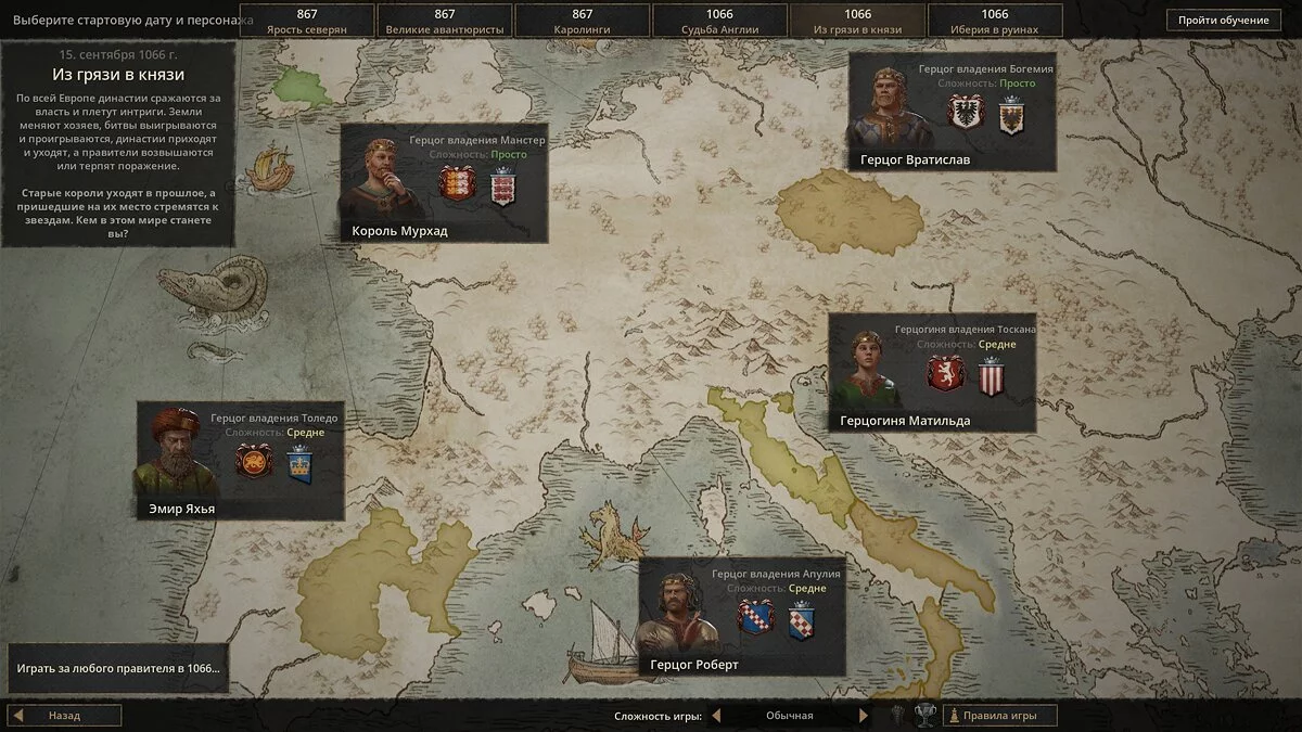 Как и предшественницы, Crusader Kings 3 посвящена Средневековью и позволяет попробовать себя в роли независимого правителя небольшого государства. На выбор доступно шесть кампаний, в каждой из которых есть несколько рекомендуемых стартовых владений. Начальную дату тоже можно выбрать — 867 или 1066 годы, а вот конечная точка зависит только от самого игрока, ведь он управляет не одним персонажем, а целой династией.