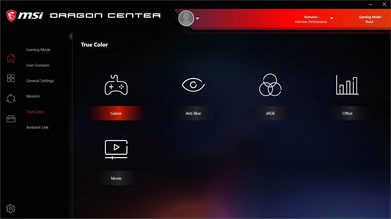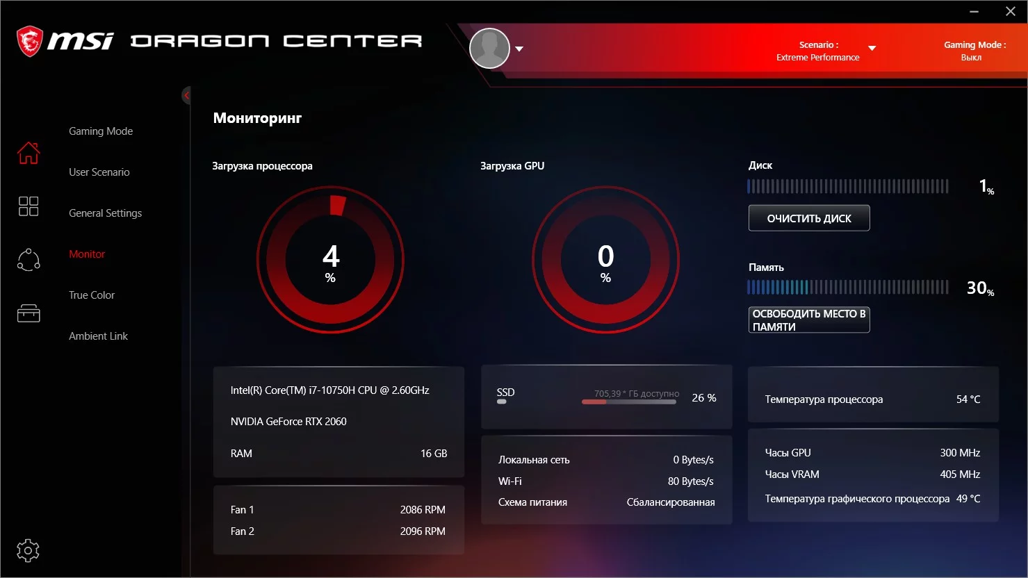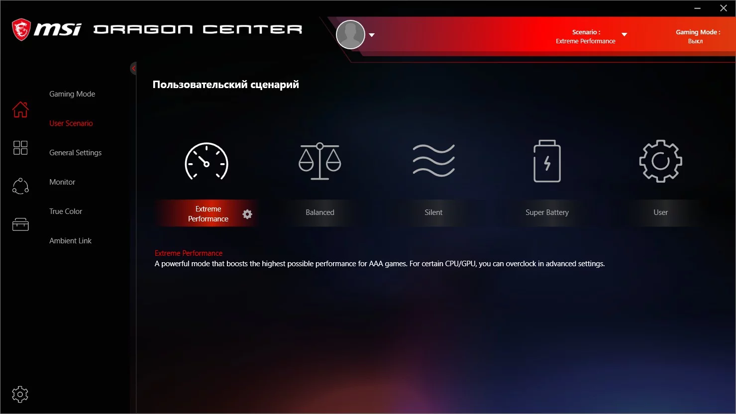 Регулировать эффективность охлаждения и производительности можно через фирменное программное обеспечение MSI Dragon Center. Для геймеров наибольший интерес представляет режим Extreme Performance. Именно в этом режиме мы проводили все тесты и замеряли температуру. Дополнительно можно активировать функцию Cooler Boost, которая обеспечивает более эффективное охлаждение, но и шум вентиляторов заметно увеличивается.