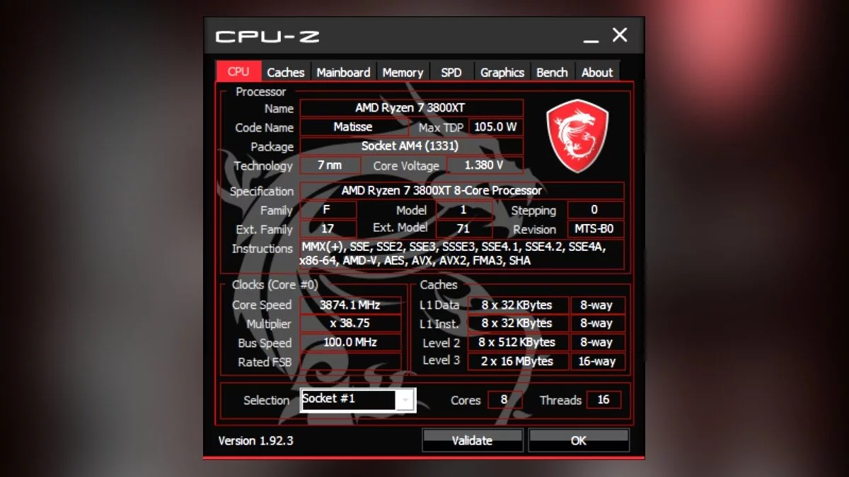 Процессор подобран под стать плате — 16-поточный Ryzen 7 3800XT с теплопакетом 105 Вт. Базовая частота составляет 3,9 ГГц, а максимальная на одно ядро — 4,7 ГГц.