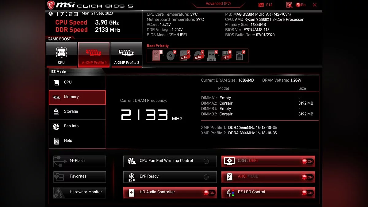 С оперативной памятью проблем тоже не возникло. По умолчанию память работала на частоте 2133 МГц, но в BIOS можно выставить A-XMP профиль 2666 МГц. Опция доступна прямо со стартового экрана и ее легко смогут активировать даже новички. Все завелось без проблем с первого раза.