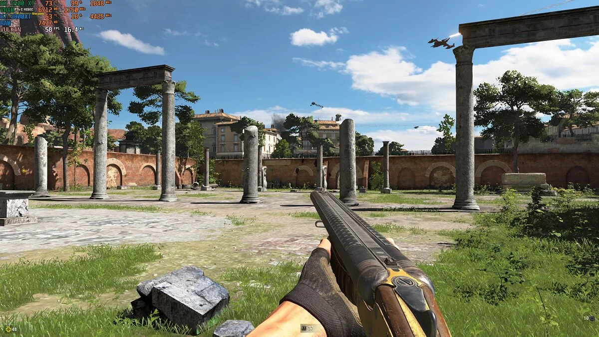 Отметим, что тест мы проводили с API Vulkan. На DirectX 12 частота кадров проседала, и игра работала заметно хуже. Для комфортного геймплея приходилось снижать настройки графики до средних.