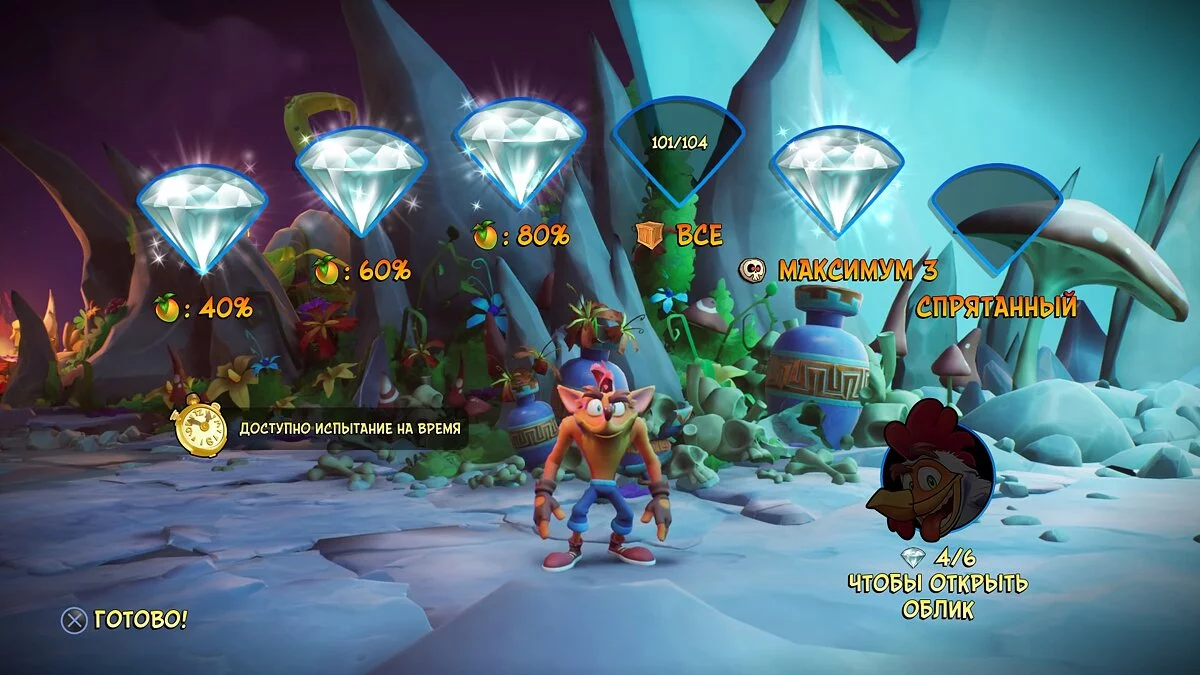 Вообще контента в игре много. Только 16-18 часов с перерывами на кофе и обед ушло на прохождение цепочки островов по сюжету без задротства в усложненных уровнях и испытаниях. Для любителей проходить игры на 200% Crash Bandicoot 4: It’s About Time предлагает собрать все альтернативные костюмы, кучу артефактов и алмазов, перепройти уже знакомые локации в эн-вертированном режиме (полностью меняет внешний вид уровня).