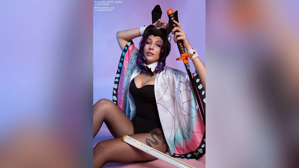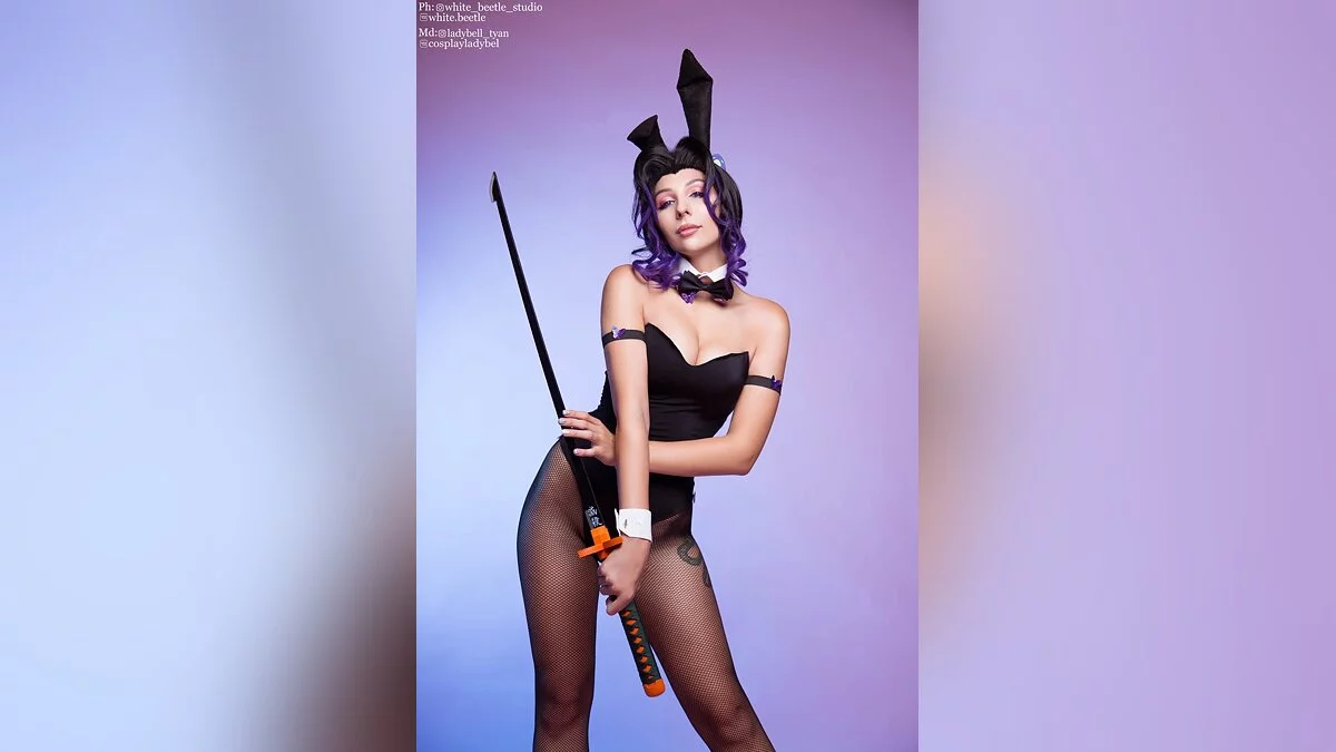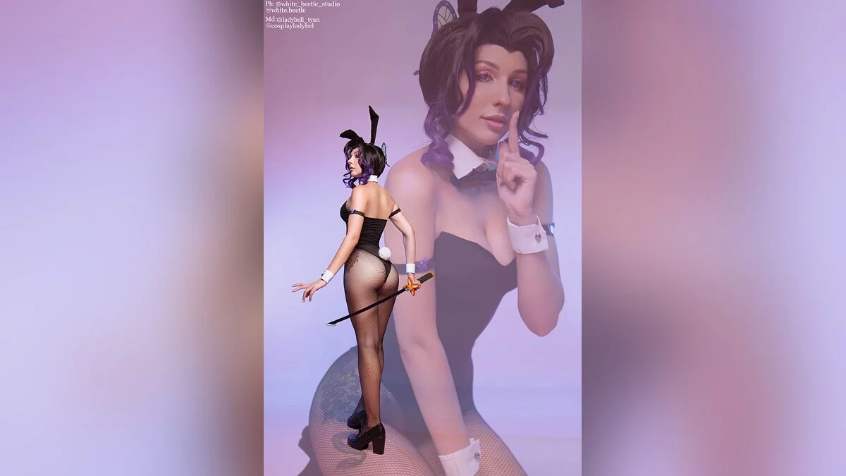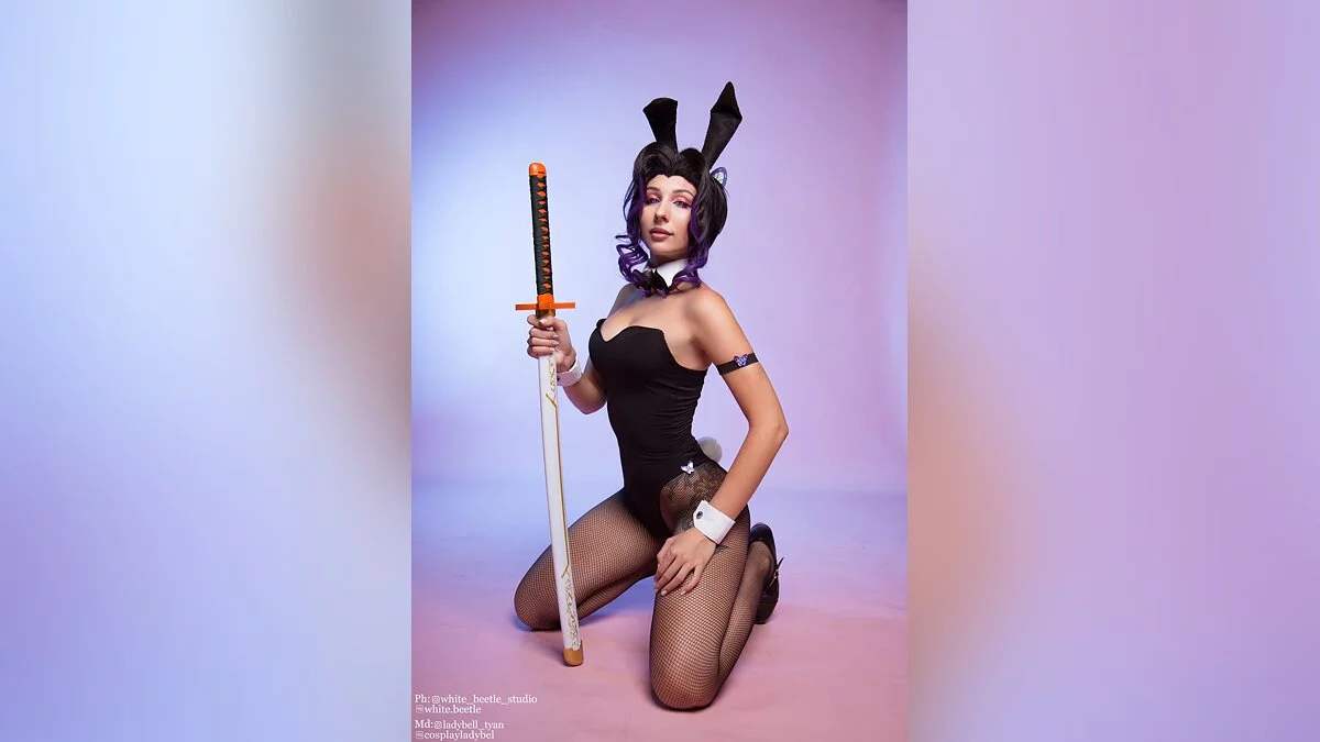 Меня впечатлила трагичная судьба Шинобу Кочо. Недавно я уже делала каноничный косплей на этого персонажа. Однако когда увидела арты в стиле Bunny Suit — не смогла пройти мимо. В результате я продемонстрировала нежную и романтичную сторону Шинобу.