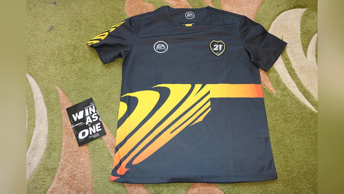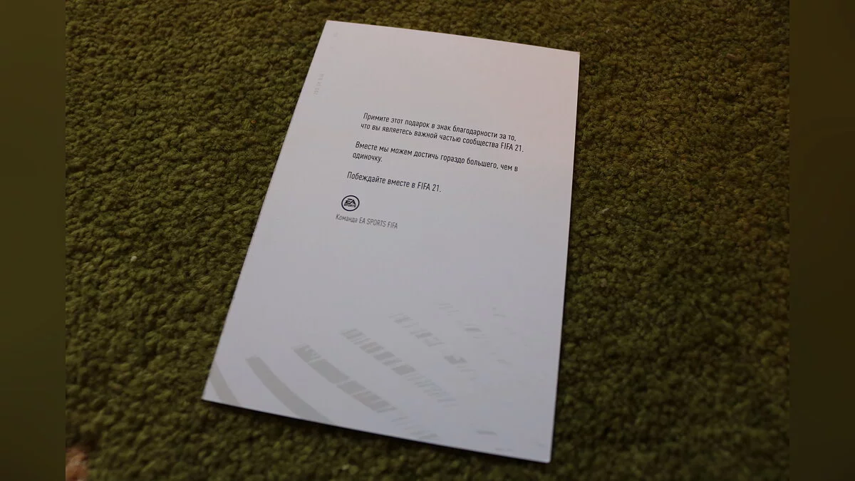 Под футболкой обнаружилась открытка с посланием: «Примите этот подарок в знак благодарности за то, что вы являетесь важной частью сообщества FIFA 21. Вместе мы сможем достичь гораздо большего, чем в одиночку. Побеждайте вместе в FIFA 21». Чуть ниже подпись: «Команда EA SPORTS FIFA». Приятно!