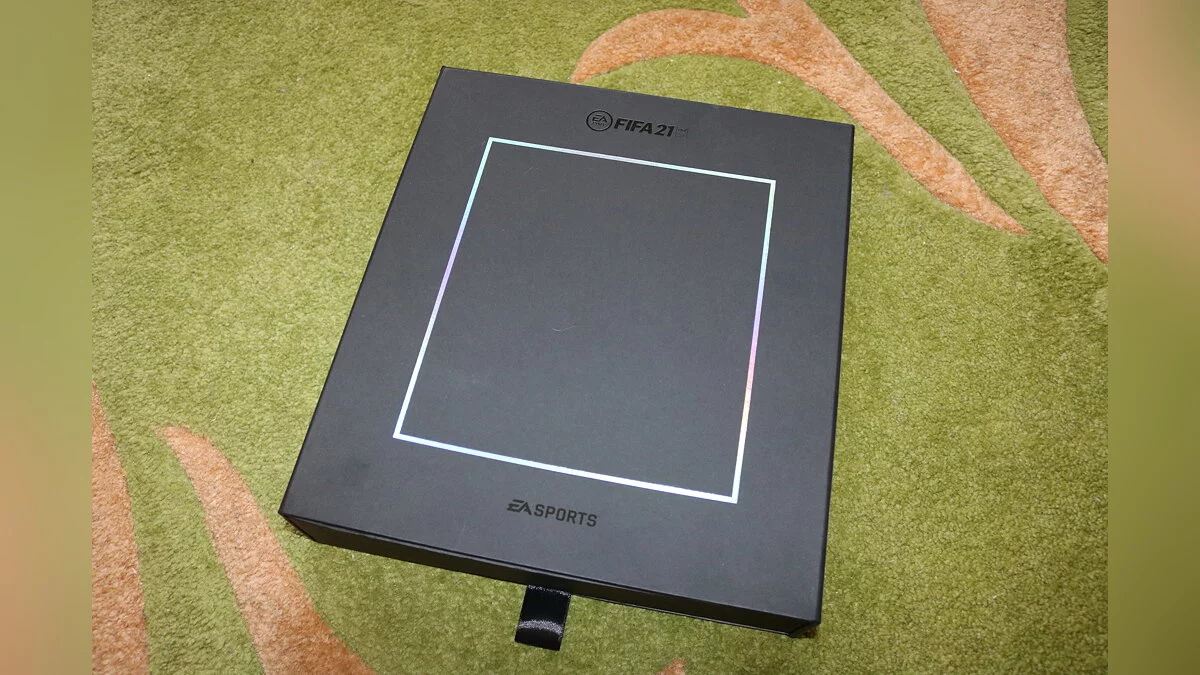 Первое, на что обращаешь внимание — это размер коробки. Она довольно крупная, из плотного, хотя и маркого картона. Единственное, что выдает содержимое набора — надписи FIFA 21 и EA Sports.