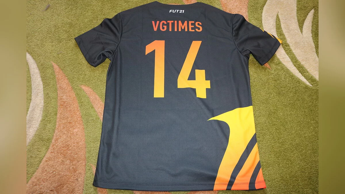 На груди отпечатан логотип ЕА и номер 21. На обратной стороне, там где обычно фамилия футболиста, красуется название нашего сайта — VGTimes. А номер нам определили 14. Интересно, почему именно так? Пишите ваши предположения в комментариях.
