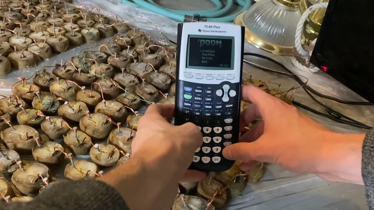 Спустя несколько лет ведущий с канала Equalo решил воплотить эксперимент в жизнь. Правда, он немного изменил условия и решил запустить популярный шутер на калькуляторе TI-84 Plus. Для работы прибору необходимы 4 пальчиковые батарейки или 200 картофелин, соединенных между собой с помощью проводов, гвоздей и монеток.