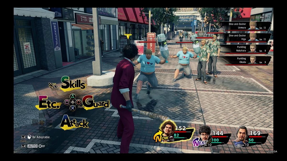 И вот здесь мы подходим к одному из самых интересных вопросов, связанных с новой Yakuza, а именно: каким образом разработчики смогли превратить «битемап» в jRPG. Сделано это было очень просто. По сути, каждое сражение, которое в номерных частях серии проходило в реальном времени, ставится на паузе. Далее ваши герои по-очереди совершают ходы, защищаются от атак противников — и так до победного. Штука здесь в том, что всю эту механику не получается воспринимать как правильную, аутентичную японскую ролевку.
