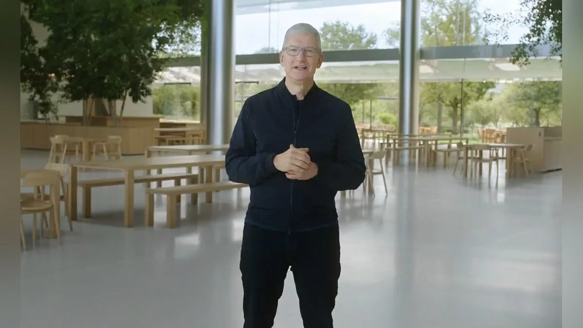 Началась презентация с демонстрации кампуса Apple, по которому гуляет Тим Кук (Tim Cook).