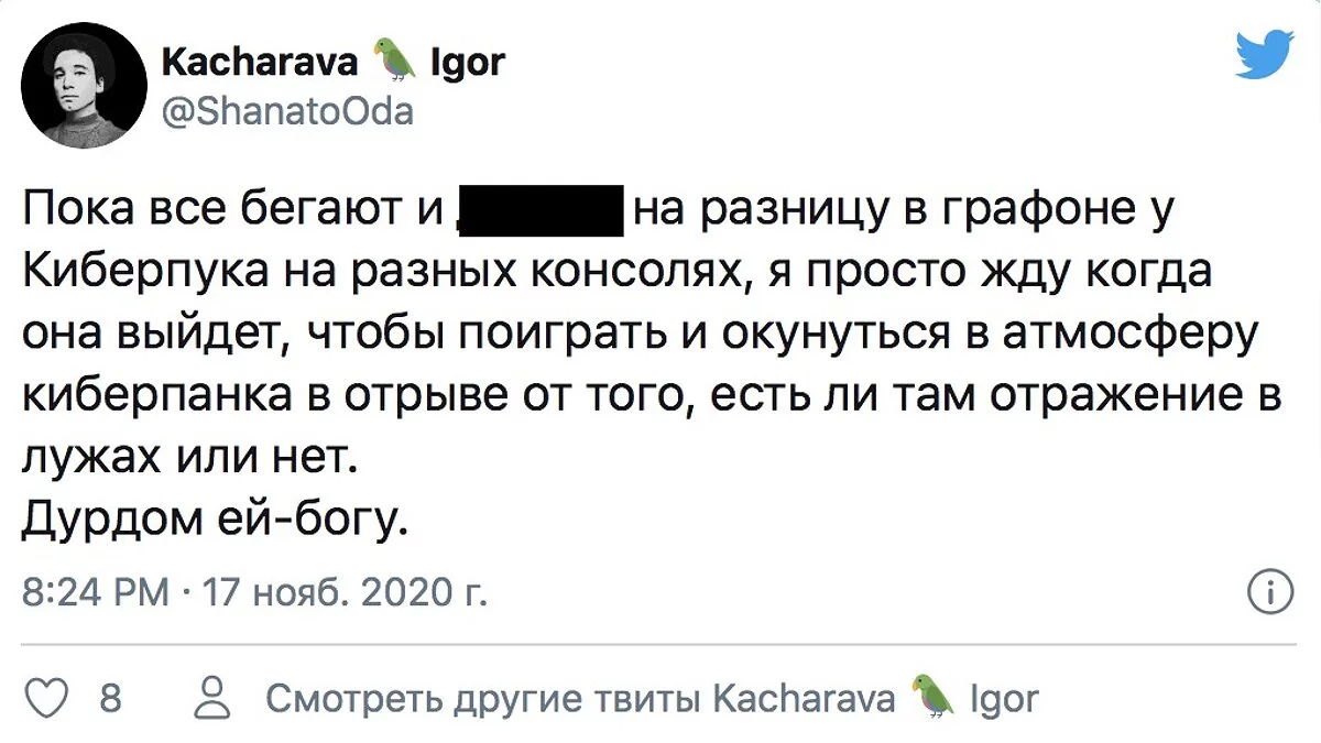 Очень больно смотреть видео геймплея киберпанка, если пыриться не на машинку в центре экрана, а вглядываться вперёд. То, как на глазах отрисовывается окружение впереди, очень напоминает олдскульные игры типа драйвера pic.twitter.com/fTjyZlEZnR