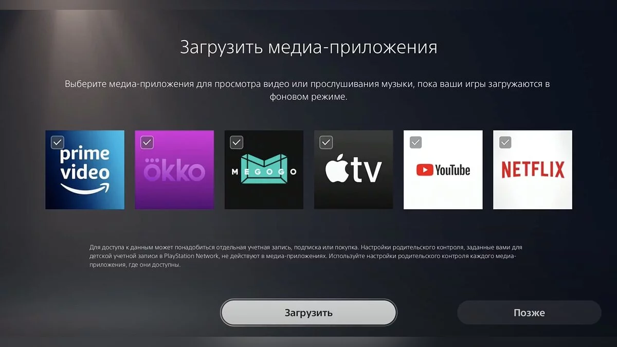 Затем Sony предлагает сразу пакетом скачать приложения Amazon Video, Okko, Megogo, AppleTV, YouTube и Netflix. Правда, кроме них скачивать всё равно нечего. В Spotify в России Sony не верят, Skype и вовсе принадлежит Microsoft, и на консоли Sony его нет. Как нет и браузера: когда-нибудь его, конечно, добавят с обновлениями, но пока, мол, нечего троянов ловить. Для этого есть PC.