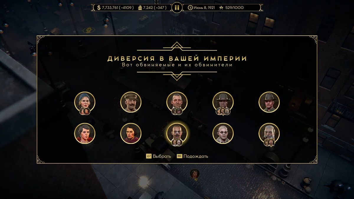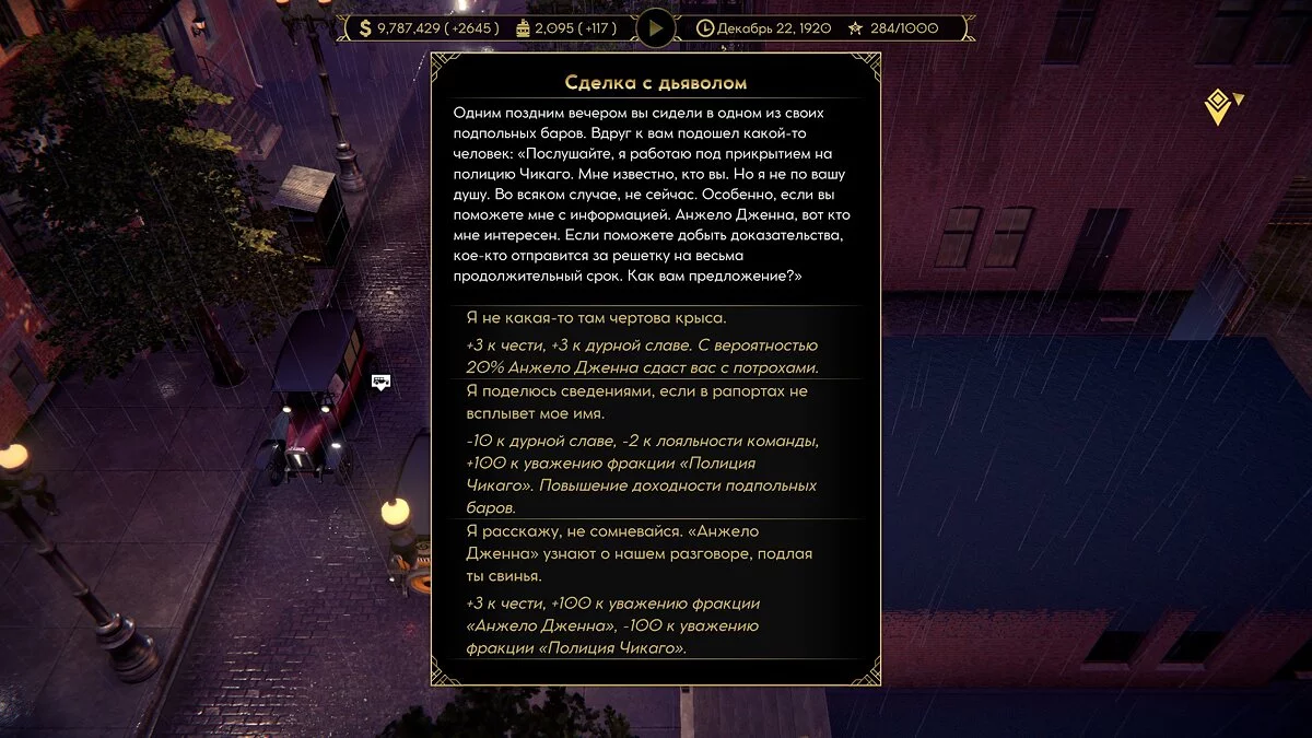 Empire of Sin начинается как настоящая ролевая игра: с нелинейными диалогами, социальными навыками и ярко выраженными последствиями любых действий. У каждого выбранного протагониста свой опенинг: будь то разговор с таксистом, членом семьи или эскортницей, которая забеременела от его сына. Собственно, эти разговоры и ведут к первому сюжетному заданию, исход которого зависит только от решения игрока. На некоторые сюжетные и побочные миссии влияют характеристики нашего босса: например с прокаченным навыком убеждения проще договариваться с полицией и заключать выгодные сделки. А сами базовые характеристики со временем меняются в зависимости от наших поступков.