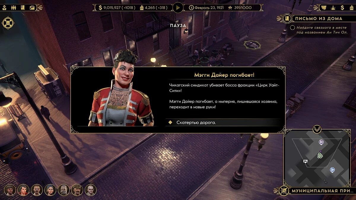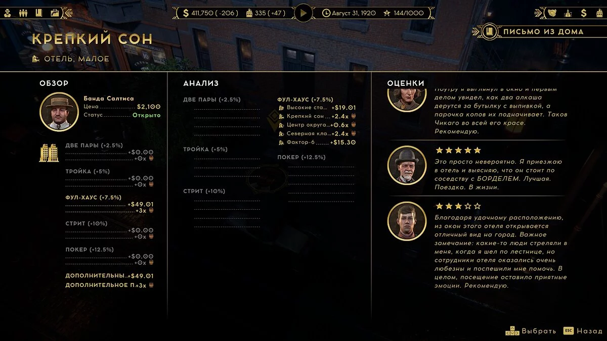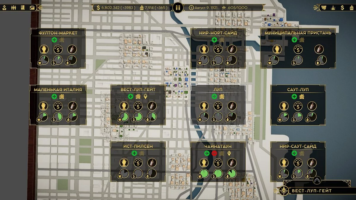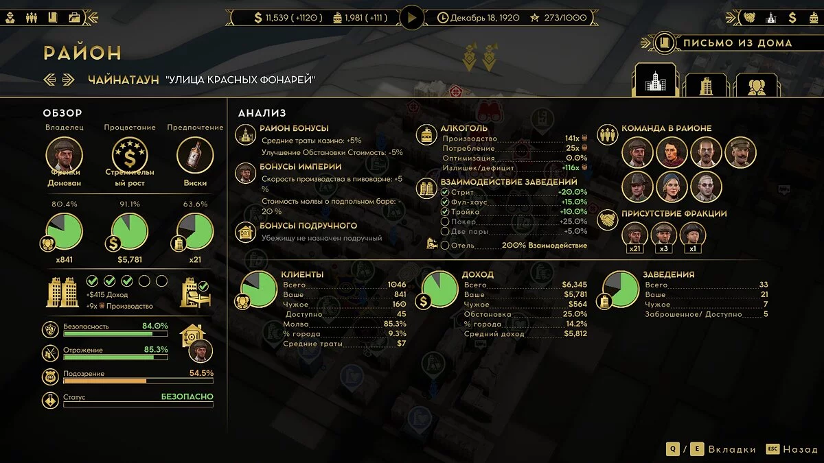 Деньги в Empire of Sin любят счёт — неграмотное распределение финансов приводит к краху и печальному финалу. Следить нужно за уймой переменных: каков чистый доход за неделю, какие заведения приносят больше денег, сколько нужно отдавать на содержание своей банды, какие союзы и договоры положительно влияют на бизнес. Именно микроменеджмент лежит в основе всей внутриигровой экономики. Чем дальше мы продвигаемся по районам Чикаго, тем больше времени проводим, зарывшись в статистику.