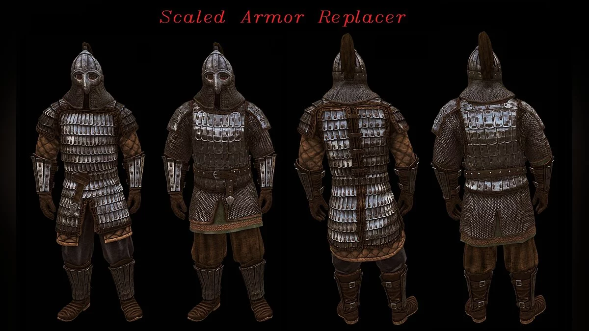 Броня распределена по всей сюжетной линии, поэтому что-то подходящее удастся найти и на первом, и на пятидесятом уровне. К примеру, броня из чешуи Алдуина откроется только после победы над Пожирателем Мира. Всё это добро (около шестидесяти комплектов) можно крафтить, улучшать, зачаровывать. Просто сказка, а не мод.