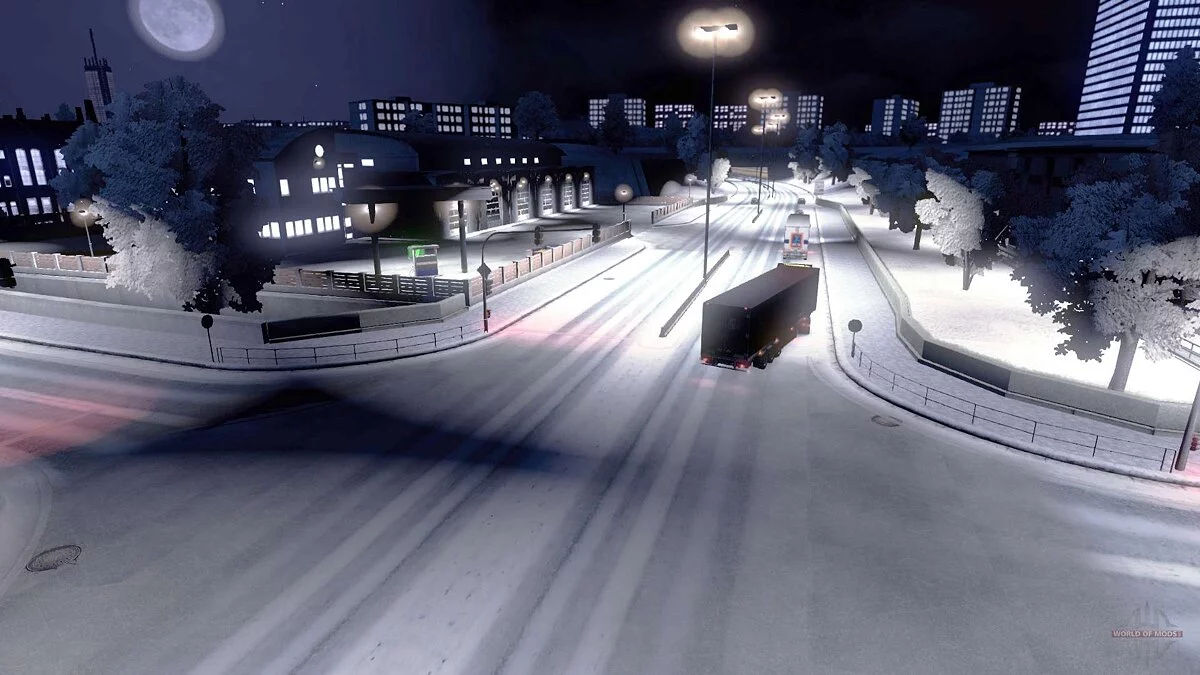Этот мод называют самым объёмным и проработанным из всех «зимних» аддонов для ETS 2. Отличий от других подобных проектов множество. В игре не просто появляются новые текстуры, вроде снега на деревьях и дорогах, а меняется физика, модель поведения автомобилей и даже погоды. Так, например, смеркается теперь намного раньше, и уже к шести вечера без дальнего света разглядеть дорогу становится проблематично. Вишенка на торте — новые звуковые эффекты, вроде метели. Одним словом, по объёму мод больше похож на полноценные DLC.
