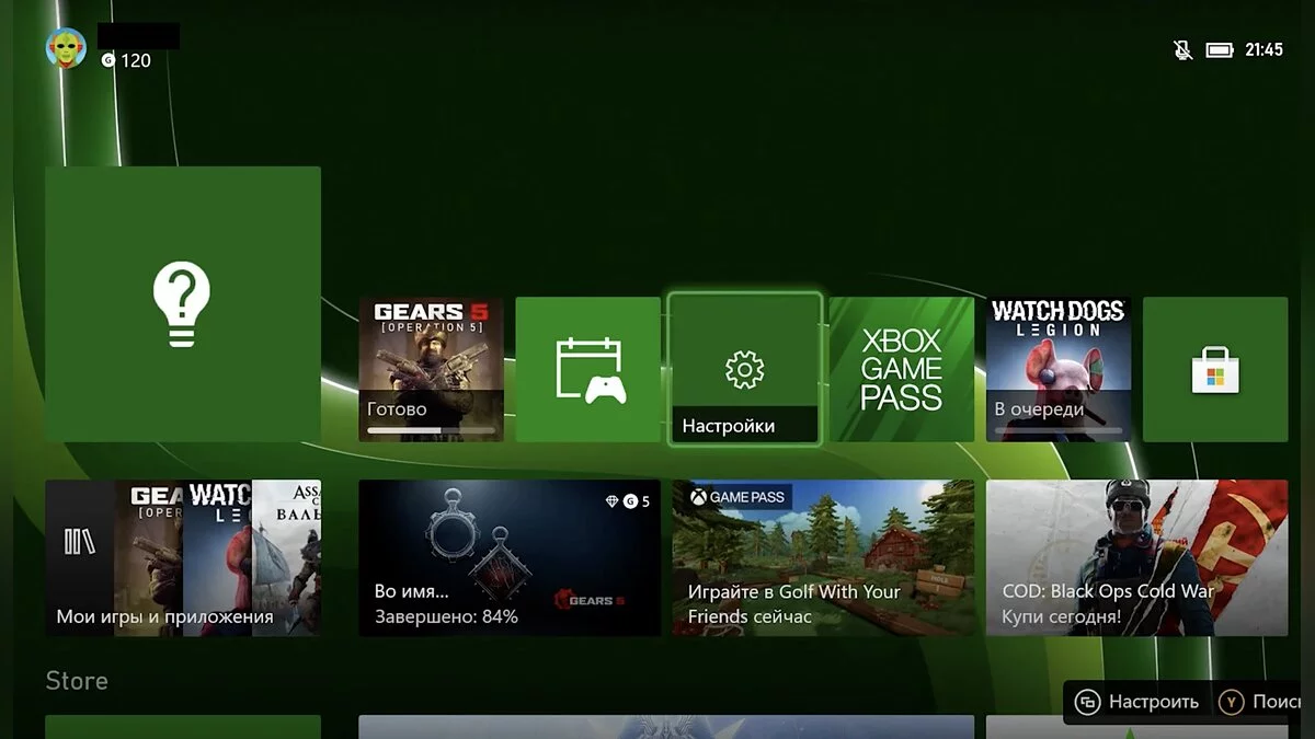 Запускаем. Меню здесь такое же, как у Series X. И оно смотрится куда симпатичнее, чем признанный «совершенным» тоскливый интерфейс PS5. На зелёном фоне переливается какая-то загогулина, функциональные плитки зовут к приключениям… Что ж, вперёд!