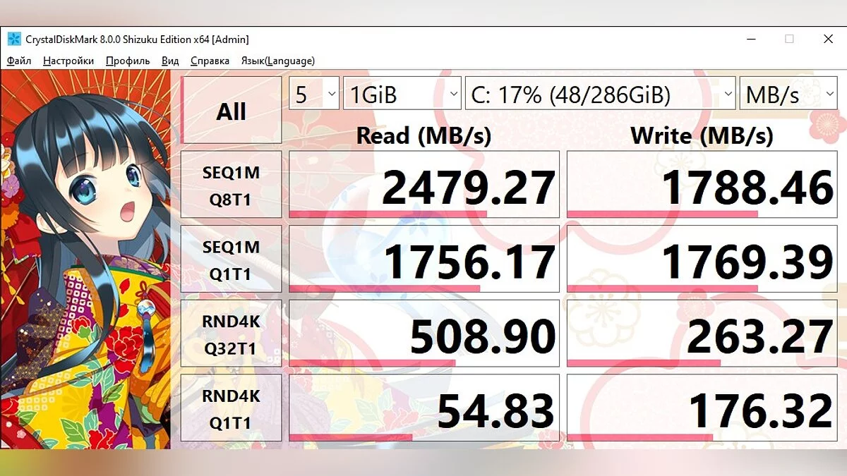 Мы измерили производительность устройства в бенчмарке CPU-Z, Cinebench R23, а также Crystal Disk Mark. Результаты — на скриншотах.
