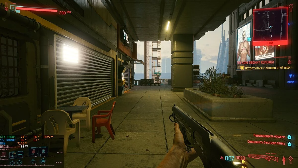 Игра выдавала от 30 до 60 кадров. Самые низкие значения были, естественно, при езде на машине по городу. Причем в некоторых особо тяжёлых ситуациях, например при очень быстрой езде или столпотворении машин, были просадки и ниже 30 кадров. Вероятно, из-за оперативной памяти, которой здесь всего 8 Гб и работает она в одноканальном режиме (но есть второй слот, куда можно установить ещё одну планку). При пешем геймплее частота была намного выше — 45-60 кадров. Проблем с отзывчивостью управления не было. Загрузка процессора поднималась вплоть до 90%. Видеокарта же была нагружена под 100%.