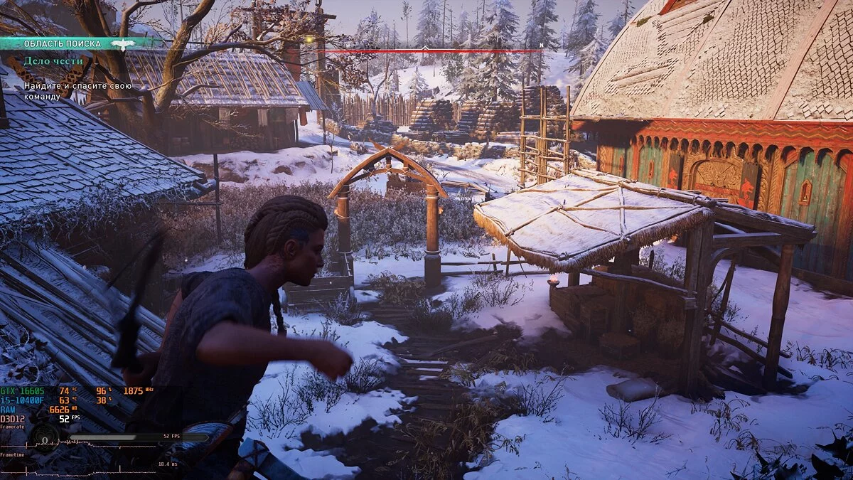 Assassin's Creed Valhalla. Мы проверяли производительность во встроенном бенчмарке и самой игре. При максимальных настройках получили 43 кадра в среднем, а показатели редких и очень редких событий составили 31 и 27 кадров соответственно. В живом геймплее игра выдает от 40 до 60 кадров.