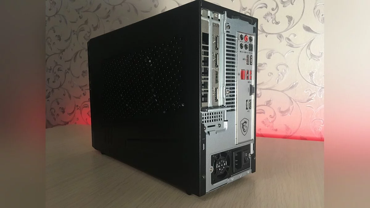 Внешне системник особо ничем не выделяется — это вполне классический дизайн. Передняя панель наполовину глянцевая, на видном месте расположен логотип MSI, есть и неброская, но стильная подсветка. В целом дизайн без излишеств, но со вкусом. Такое устройство впишется в любой интерьер, хотя в офисе он будет смотреться чересчур агрессивно. Оформление все же не настолько строгое.