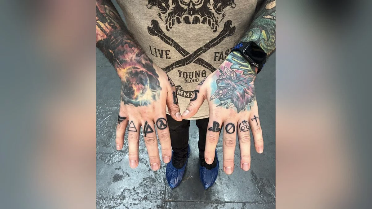 Чуть ниже, на предплечье, у Panda FX набит Пирамидоголовый — маскот и главный монстр Silent Hill 2. На пальцах молодого человека тоже есть несколько интересных нам символов. Сможете узнать все?