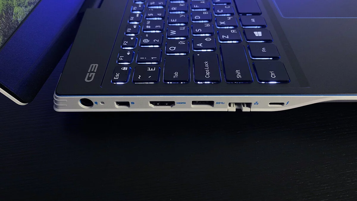 Отметим широкий набор портов. На левой стороне расположены: разъём питания, mini DisplayPort, HDMI, USB 3.2 Gen1 Type-A, гигабитный Ethernet и Thunderbolt 3.