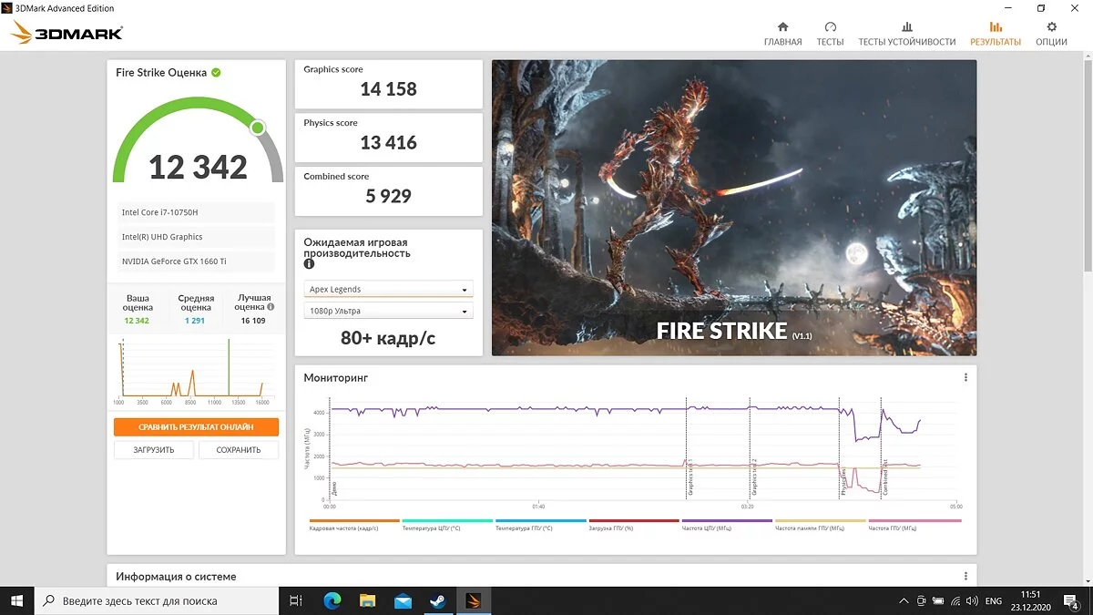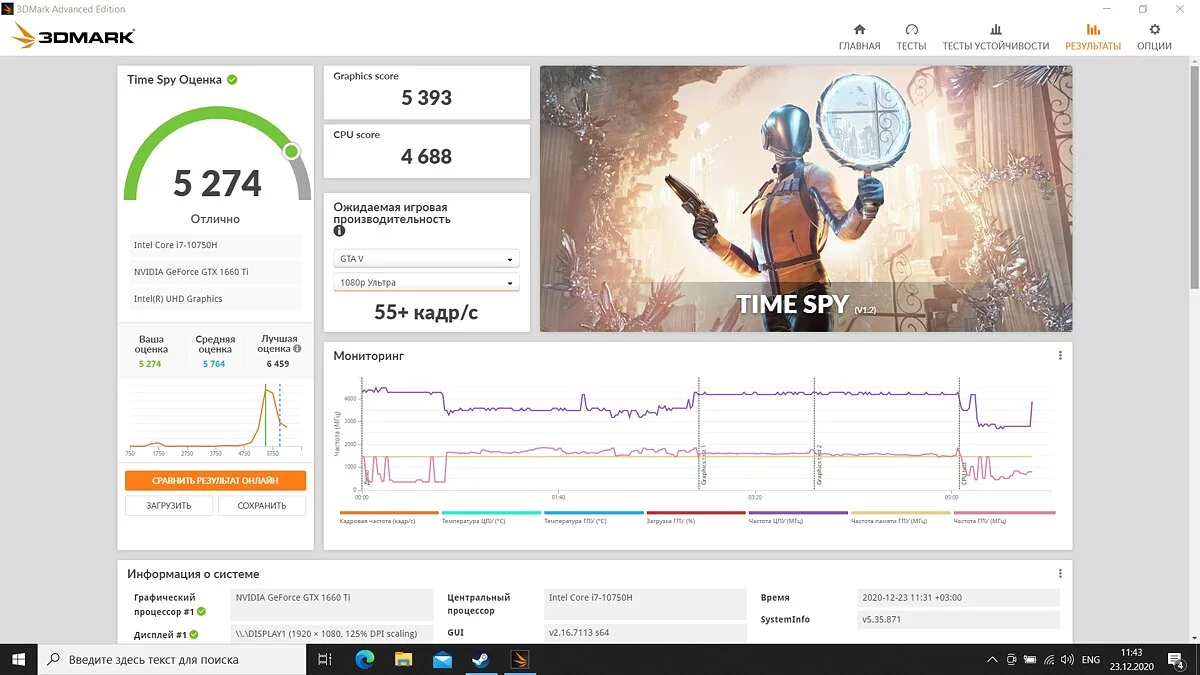 Не обошли мы стороной и тесты 3DMark в Time Spy и Fire Strike, где Dell G3 не поразил воображение, но выдал вполне ожидаемые для такой начинки результаты.